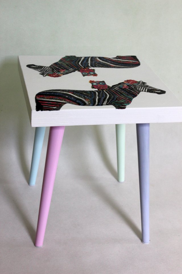 Siedzisko natomiast pomalowane zostało na biało (również ekologiczną, białą farbą) a następnie przyozdobione (motyw Zebry) techniką decoupage.