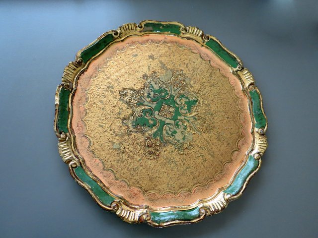 Taca holenderska wykonana z drewna lub masy drewnianej [jest dosyć lekka]. Podmalowana, poprzecierana złotą farbą, celowo podniszczona [porysowana]. Jedno małe pęknięcie na brzegu i odpryski farby [ wyglądają na celowe ].