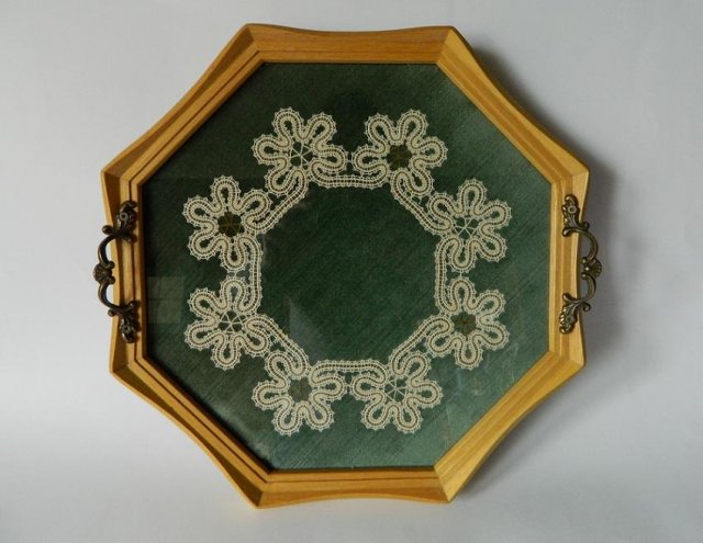 Totalny unikat :) !!! Taca z misterną frywolitkową wstawką wykonaną ręcznie. Autorka poświęciła wiele godzin na stworzenie tego cacka - znam ją osobiście. Frywolitka w kolorze ecru i ciemnego ugru na zielonym welurowym podkładzie , całość zamknięta drewnianą ośmioboczną ramką. Przedmiot naprawdę wyjątkowy, polecam, bo to pojedynczy egzemplarz. Rozmiar idealny do podania kawki :)