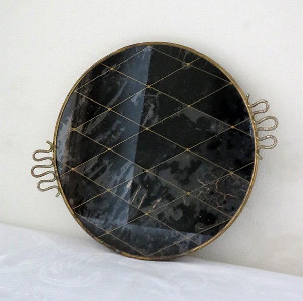 Tortownica, taca w czarno-złoty wzór. Mosiężne okucia-uchwyty. Lata 50-te.