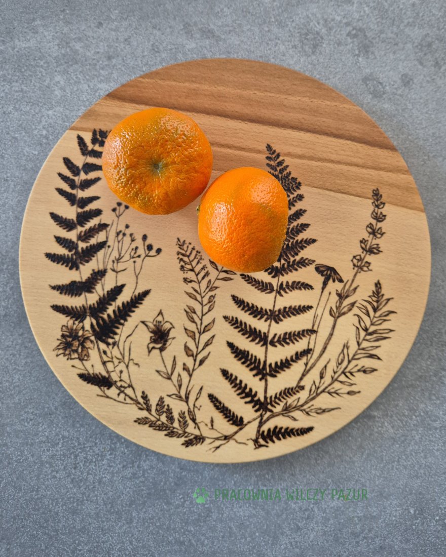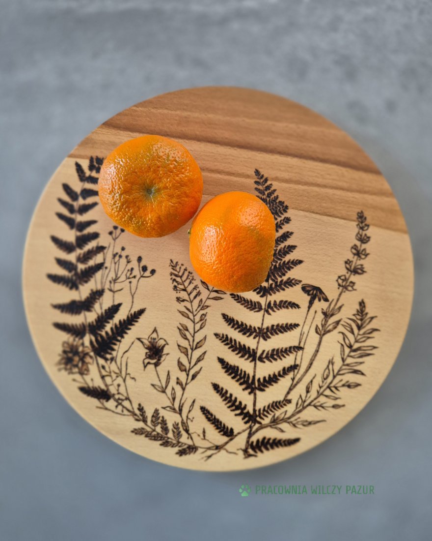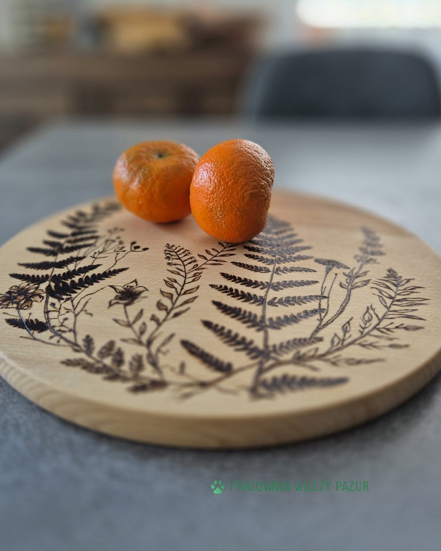 Przedstawiam ozdobną tacę, która może także służyć jako deska do serwowania lub po prostu ciekawa dekoracja kuchni. Jeśli ktoś woli - można do niej dodać zaczep do zawieszenia ( wysyłam w komplecie) i powiesić na ścianie jako obrazek. Deska została wykonana z drewna bukowego i ozdobiona przeze mnie pirografią z ręcznie wypalonym motywem roślinnym. Drewno zostało zabezpieczone poprzez olejowanie bezzapachowym olejem, który nie jełczeje. Nadaje się do kontaktu z żywnością.