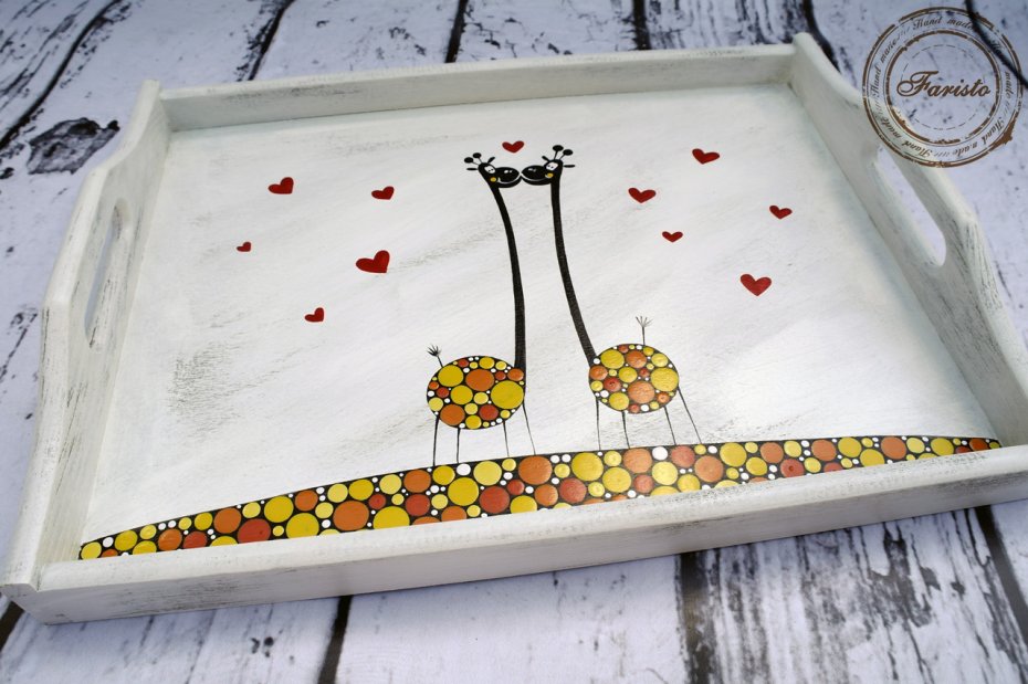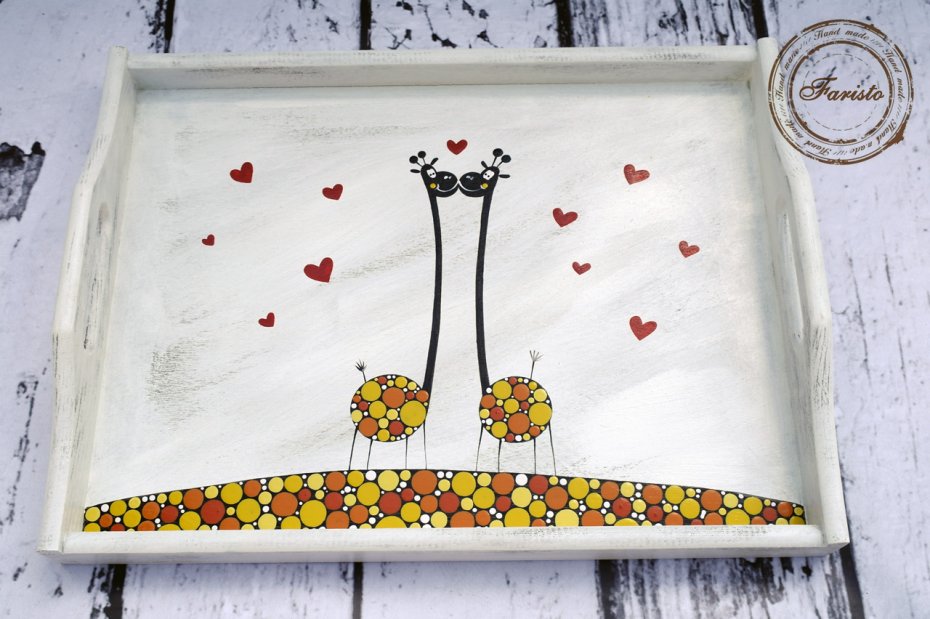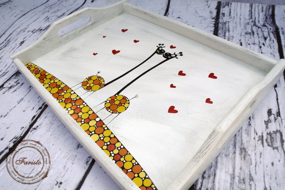 Ręcznie malowana farbami akrylowymi drewniana taca. Wzór jest pokryty lakierem co zabezpiecza go przed ewentualnym kontaktem z wodą. Tacę można myć mokrą ściereczką. Istnieje możliwość dopisania imion pary młodej, daty ślubu, cytatu, dedykacji.