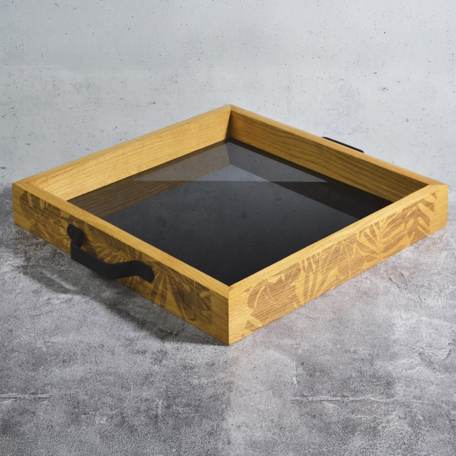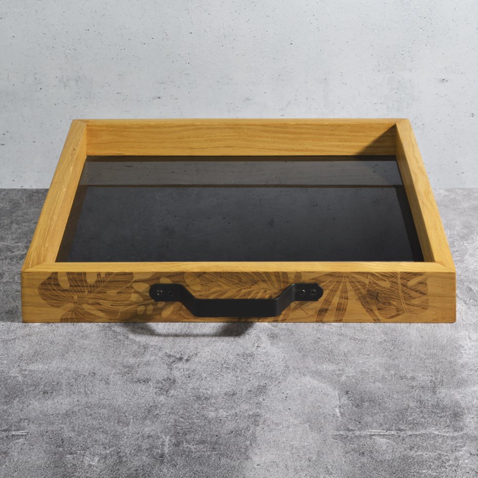 Precyzja linii spotyka naturalność materiału. Ta ręcznie wykonana taca z litego drewna dębowego została wzbogacona o floralny, laserowo grawerowany wzór, który buduje uporządkowaną, niemal architektoniczną strukturę na powierzchni boków. Motyw ten subtelnie pracuje z układem słojów, tworząc spójną, rytmiczną kompozycję.