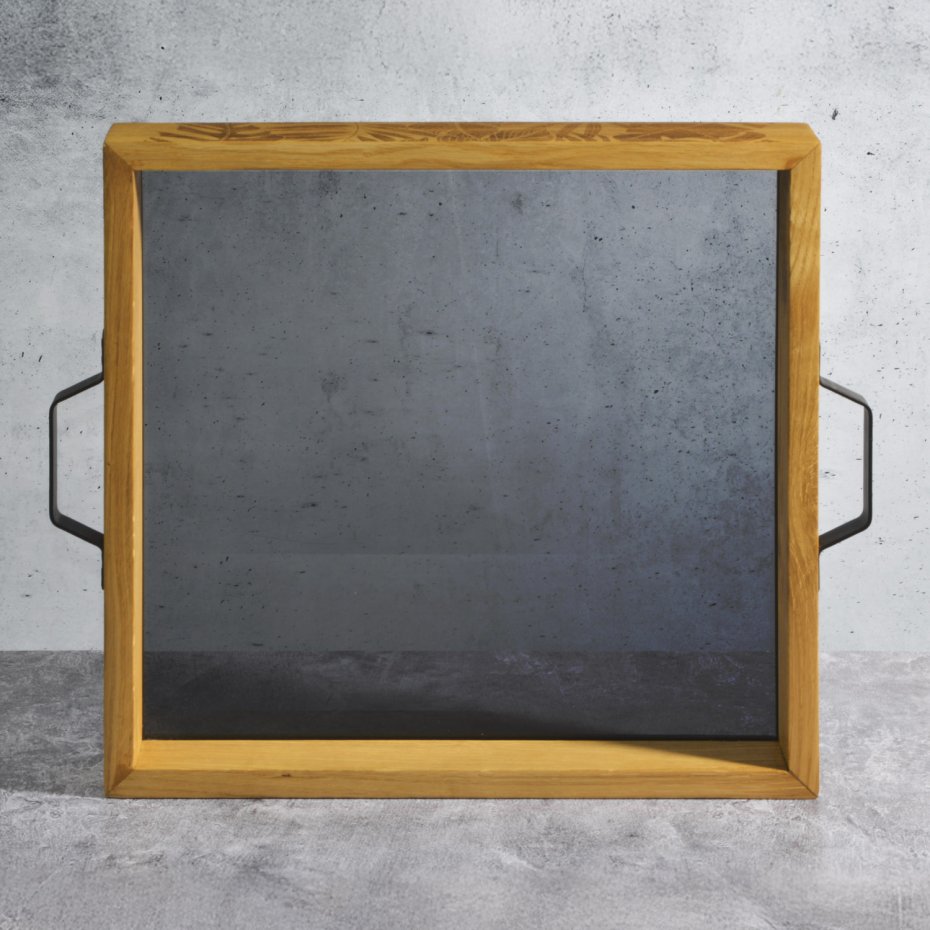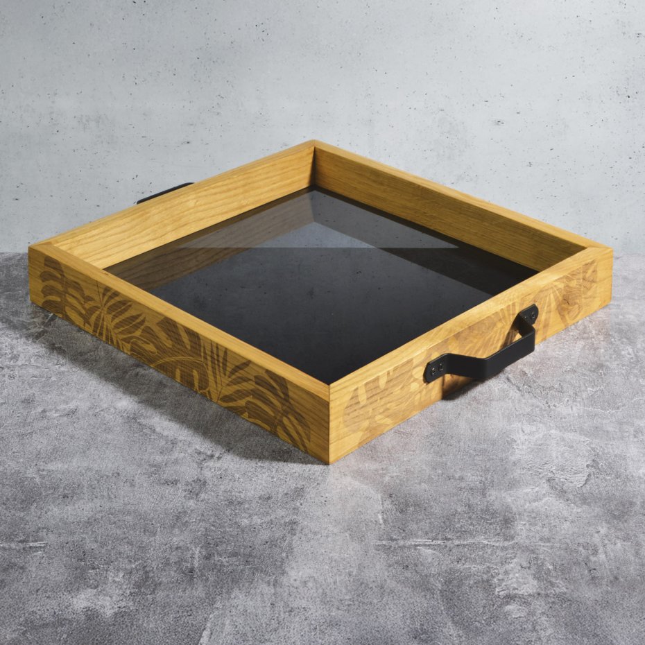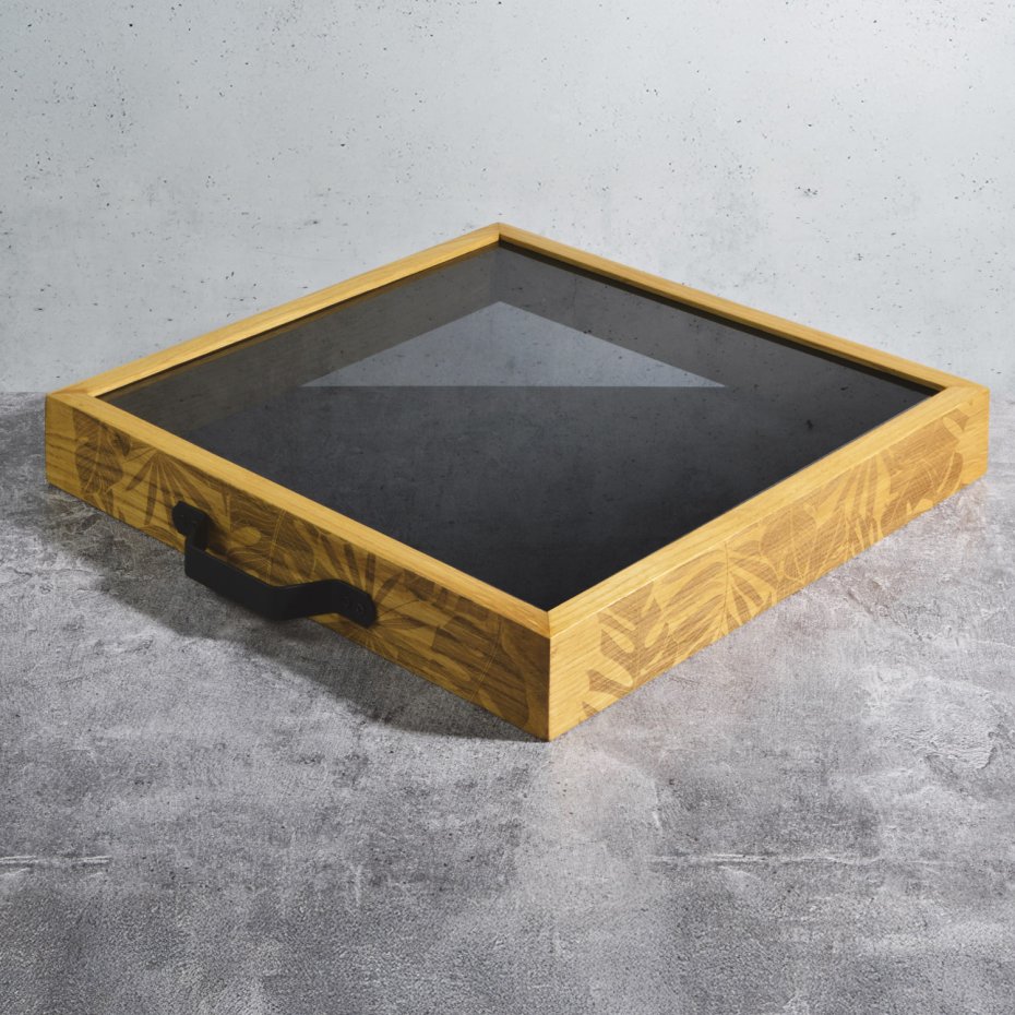 Dno wykonane jest z grafitowego szkła. Takie zestawienie daje efekt głębi i delikatnego odbicia, które nie dominuje, lecz podkreśla obecność przedmiotów ustawionych na tacy. Światło przenika przez szkło i odbija się od szkła, tworząc spokojną, elegancką atmosferę.