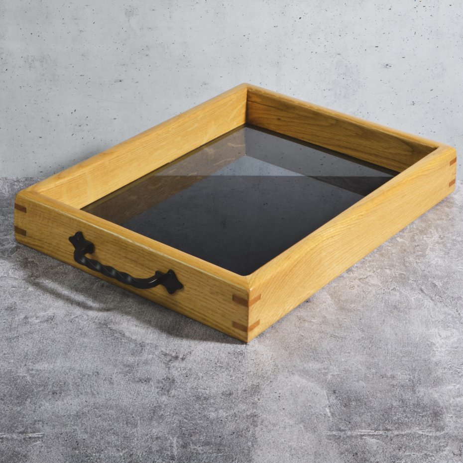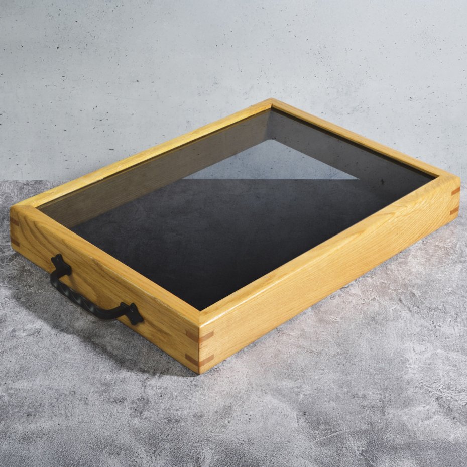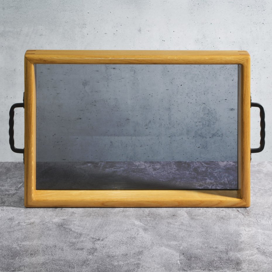 Dno z grafitowego szkła hartowanego nadaje całości głębi i lekko przyciemnia odbicie. Powierzchnia reaguje na światło – tworzy spokojne, uporządkowane tło dla przedmiotów.