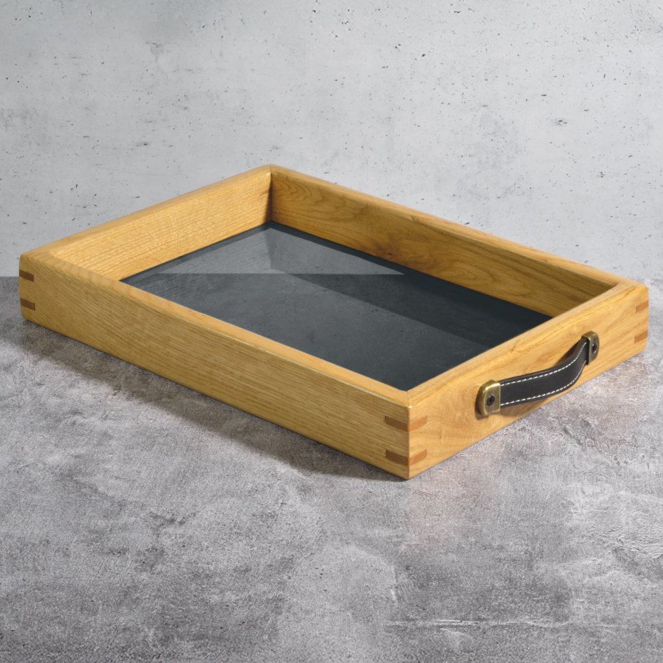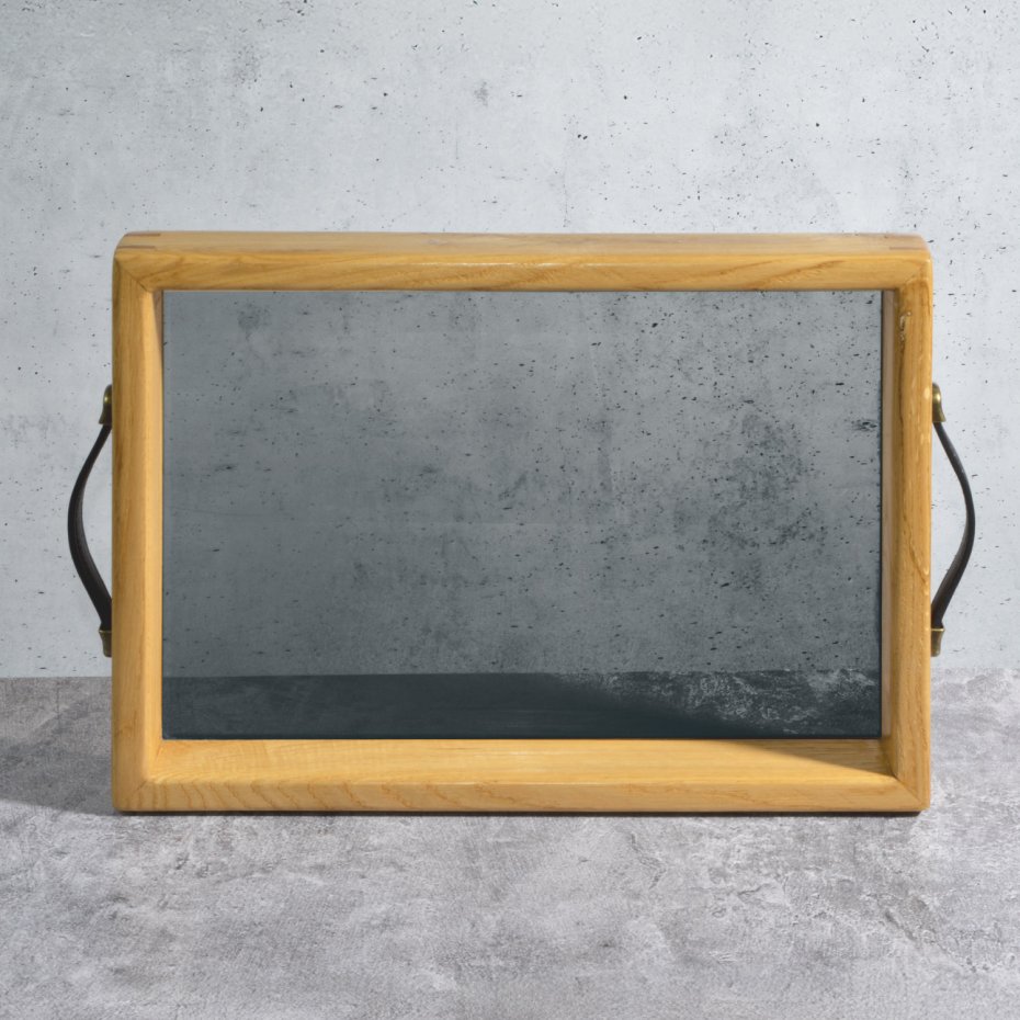 Rama z litego drewna dębowego wnosi naturalne ciepło i równoważy chłodny odcień szkła. Widoczne łączenia oraz rysunek słojów podkreślają rzemieślniczy charakter wykonania.