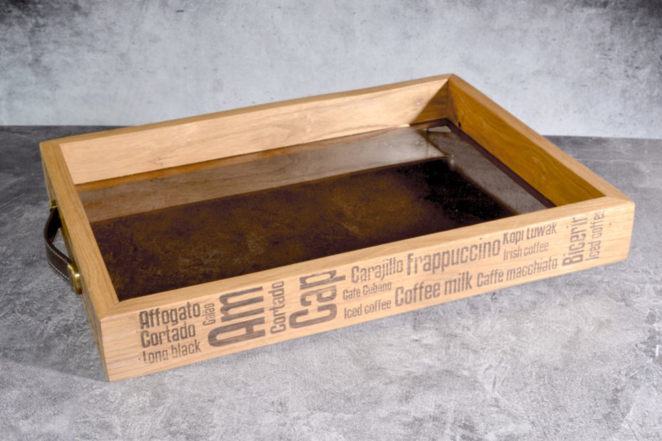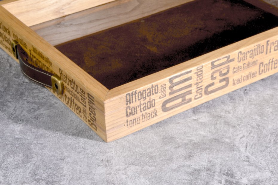 Boki tacy zdobi subtelny, laserowo grawerowany motyw inspirowany kulturą kawy – nazwy klasycznych napojów tworzą rytmiczną kompozycję typograficzną, która nadaje całości nowoczesny, nieco industrialny charakter.