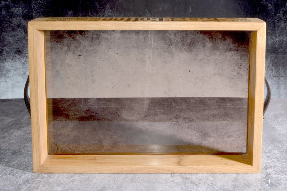 Minimalistyczna forma spotyka się tu z wyrazistym detalem. Ręcznie wykonana taca z litego drewna dębowego została uzupełniona o dno z barwionego szkła, które w zależności od światła delikatnie zmienia swój charakter – od głębokiego brązu po niemal transparentną taflę.
