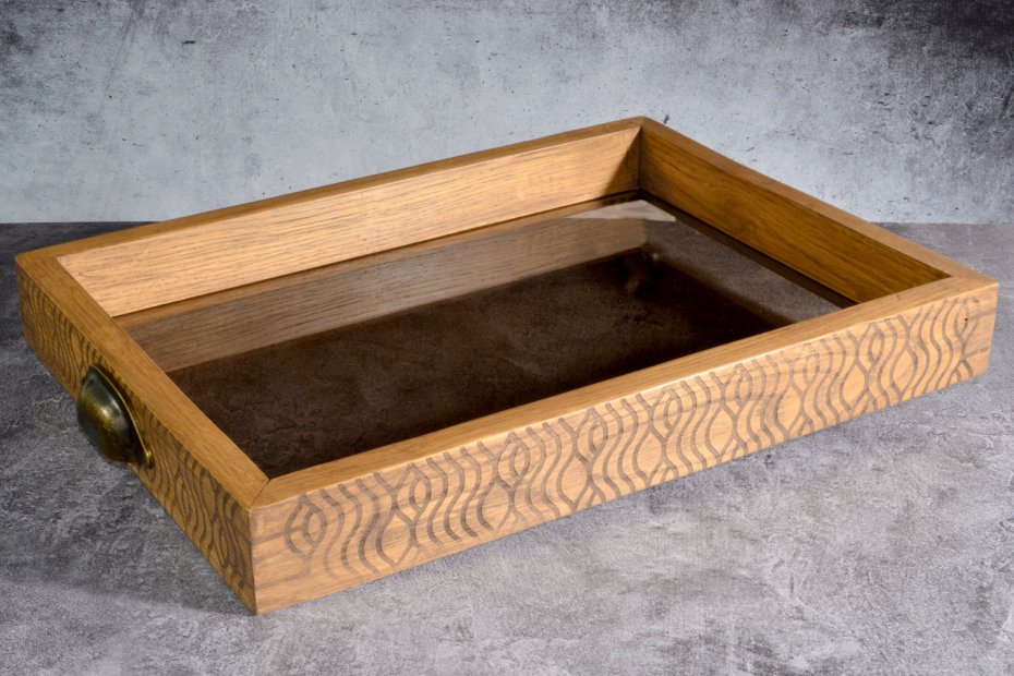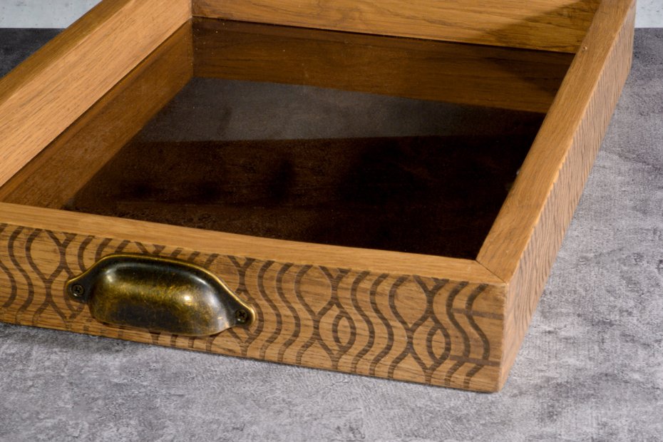 Dno wykonane z 6 mm szkła w odcieniu brązu subtelnie filtruje światło i wprowadza spokojny, ciepły ton. Transparentność szkła sprawia, że taca nie jest wizualnie ciężka – raczej "unosi" przedmioty, które na niej ustawisz.