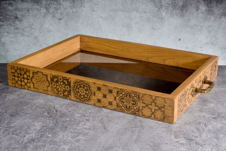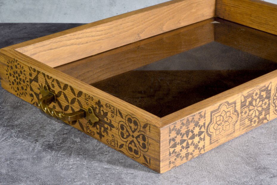 Wyrazisty detal spotyka się tu z prostą, uporządkowaną formą. Ręcznie wykonana taca z litego drewna dębowego została ozdobiona kompozycją geometrycznych, inspirowanych tradycyjną ornamentyką wzorów. Laserowy grawer tworzy rytmiczną "mozaikę", która nadaje całości charakter i przyciąga uwagę, jednocześnie pozostając spójną z naturalnym rysunkiem drewna.