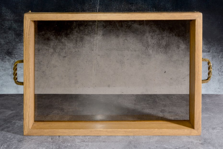 Dno wykonane z 6 mm szkła w odcieniu brązu subtelnie filtruje światło i dodaje kompozycji głębi. Transparentna powierzchnia sprawia, że taca zachowuje lekkość wizualną, mimo solidnej, dębowej konstrukcji.