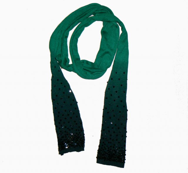 Długi wąski szaliczek renomowanej marki Taifun. Nasycona zieleń stopniowo cieniowana jest do bardzo ciemnej, niemalże czarnej. Końce wykończone naszywanymi czarnymi cekinami.