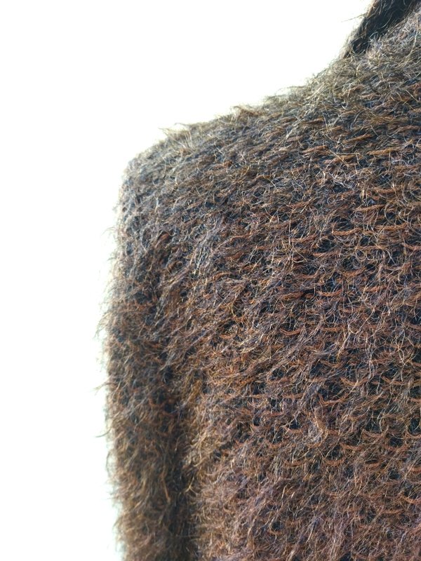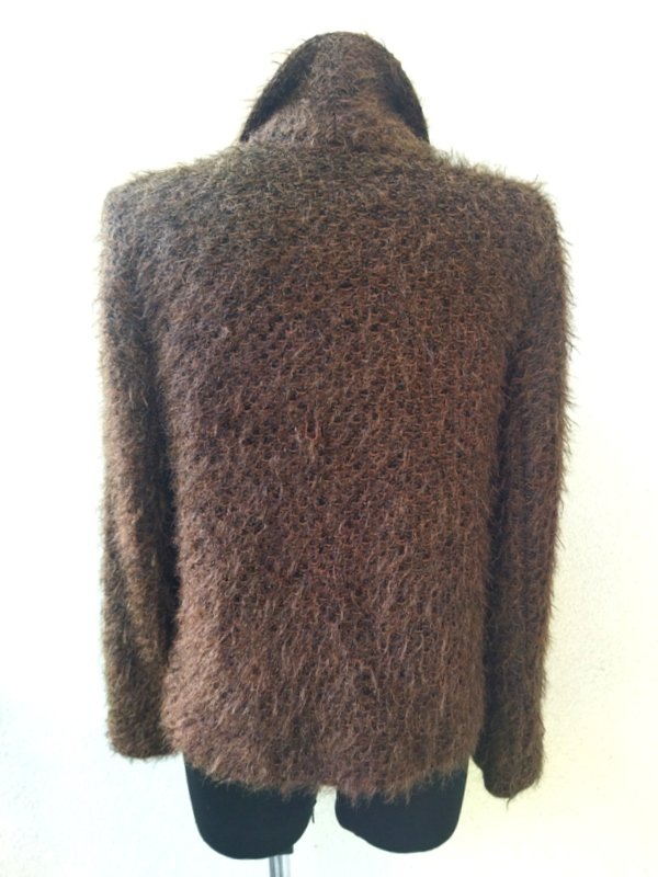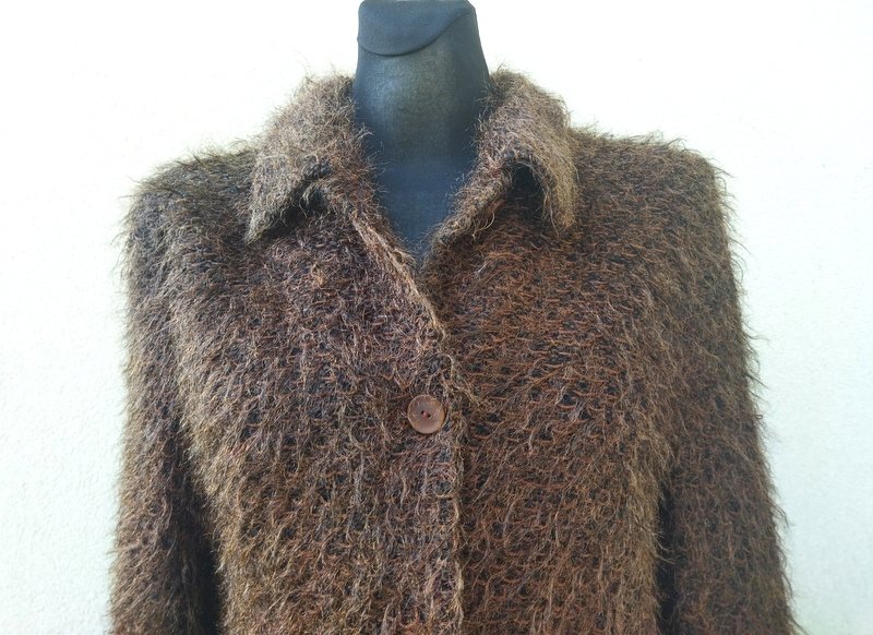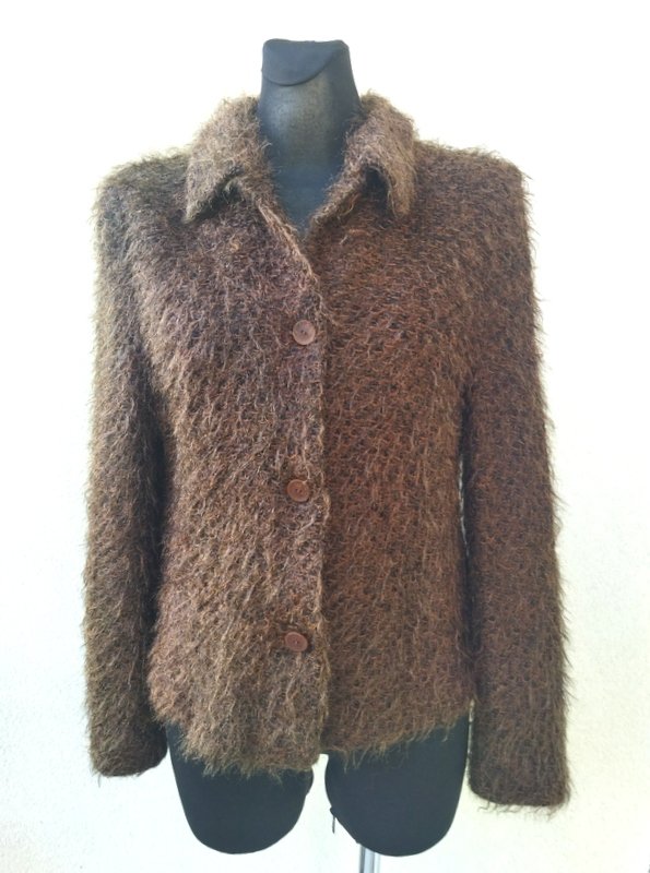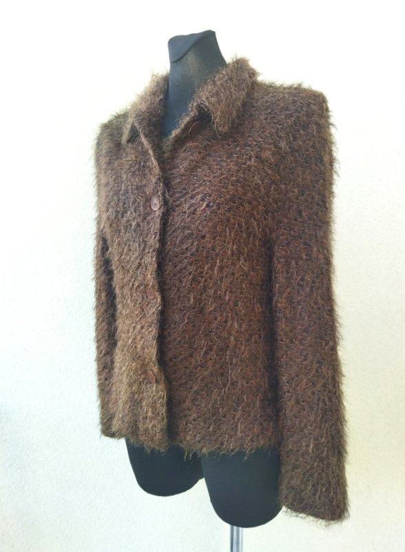 Dzianinowy żakiet lub sweter z ciekawej włochatej tkaniny dzianinowej w czekoladowym kolorze przetykanej sznureczkową włóczką na czarnym podłożu. Z kołnierzem, zapinany na guziki. Miły mięciutki i puszysty
