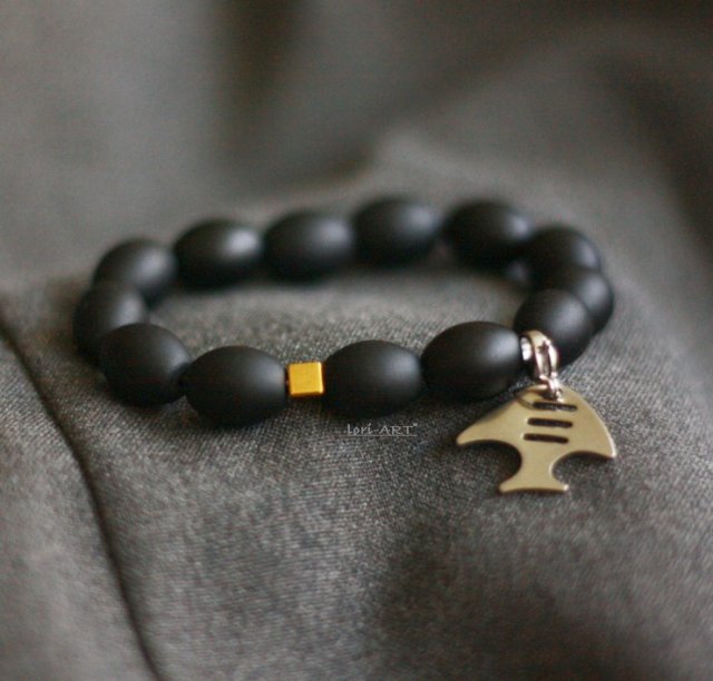 Intrygująca bransoletka wykonana z naturalnych kamieni -matowy szroniony onyks czarny (wys.ok -12 mm) kwadracik złotego hematytu dla kontrastu, oraz elementów ze stali szlachetnej najwyższej jakości . Stal szlachetna, zwana również chirurgiczną nie powoduje reakcji uczuleniowych,nie zmienia barwy, jest odporna na korozje i wygląda designersko , zawieszka na odpinanym karabińczyku , bransoletka na mocnej gumce silikonowej .Biżuterie wysyłam w ozdobnym bezpiecznym opakowaniu . Bransoletka pasuje na nadgarstek 15-16 cm .