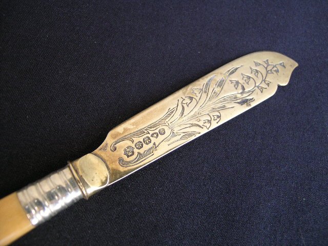 Jeden z najpiękniej zdobionych noży, jakie widziało oko moje :) Kwiatowa dekoracja jak czysta poezja Keatsa :) Romantyczny, z mosiężnym ostrzem i rączką z masy dawnej daty. Kształtem podobny do noży do ryb, ale chyba bardziej ukochany będzie, gdy jako zupełnie wyjątkowy, celebracyjnej intencji pełny, do otwierania listów posłuży. Ach ! nie mam więcej słów... 18,5 x 2 cm. Stan zachowania dobry plus. Przedmiot z duszą, wyjątkowej urody :) W rzeczywistości o wiele głębsza tonacja kolorów - przeprosiny za prześwietlone zdjęcia :)