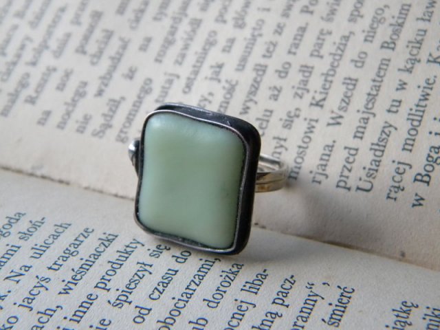 pierścionek z miedzi,cyny i szkła. wymiary 2,3cm x 2,3cm. rozmiar regulowany.szkło matowe z niewielkim połyskiem