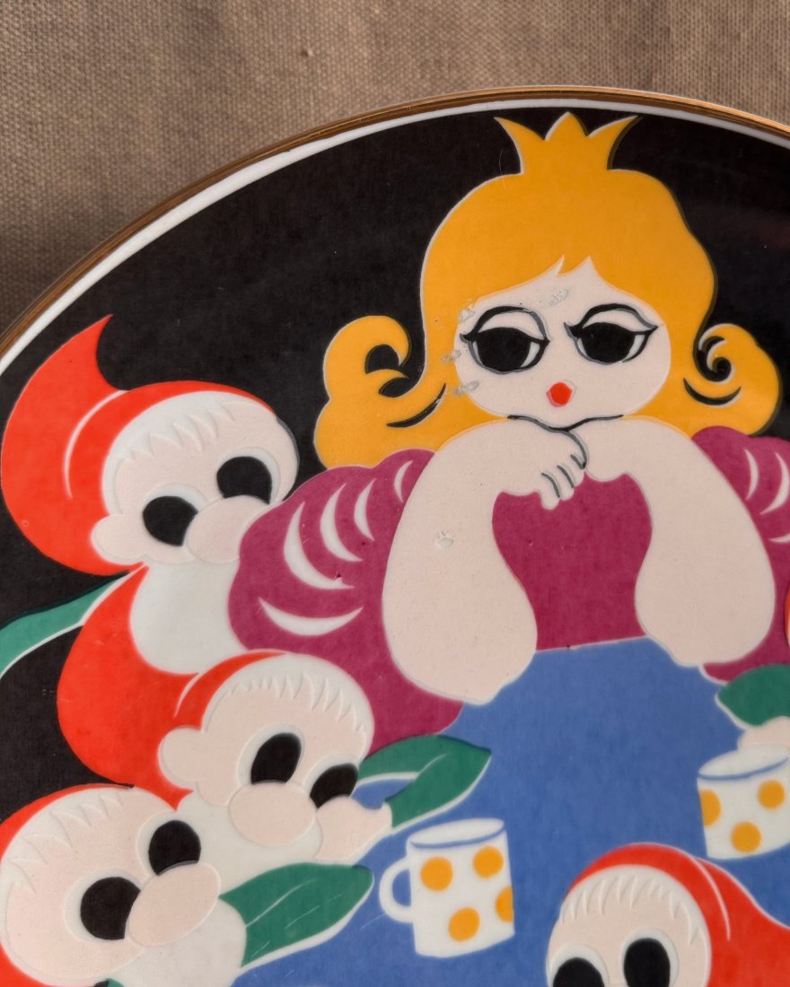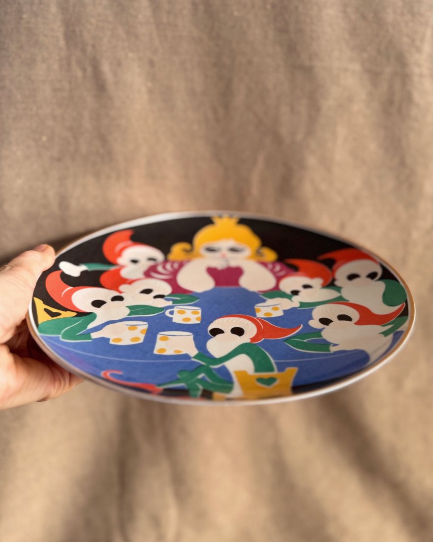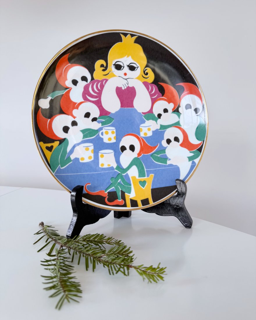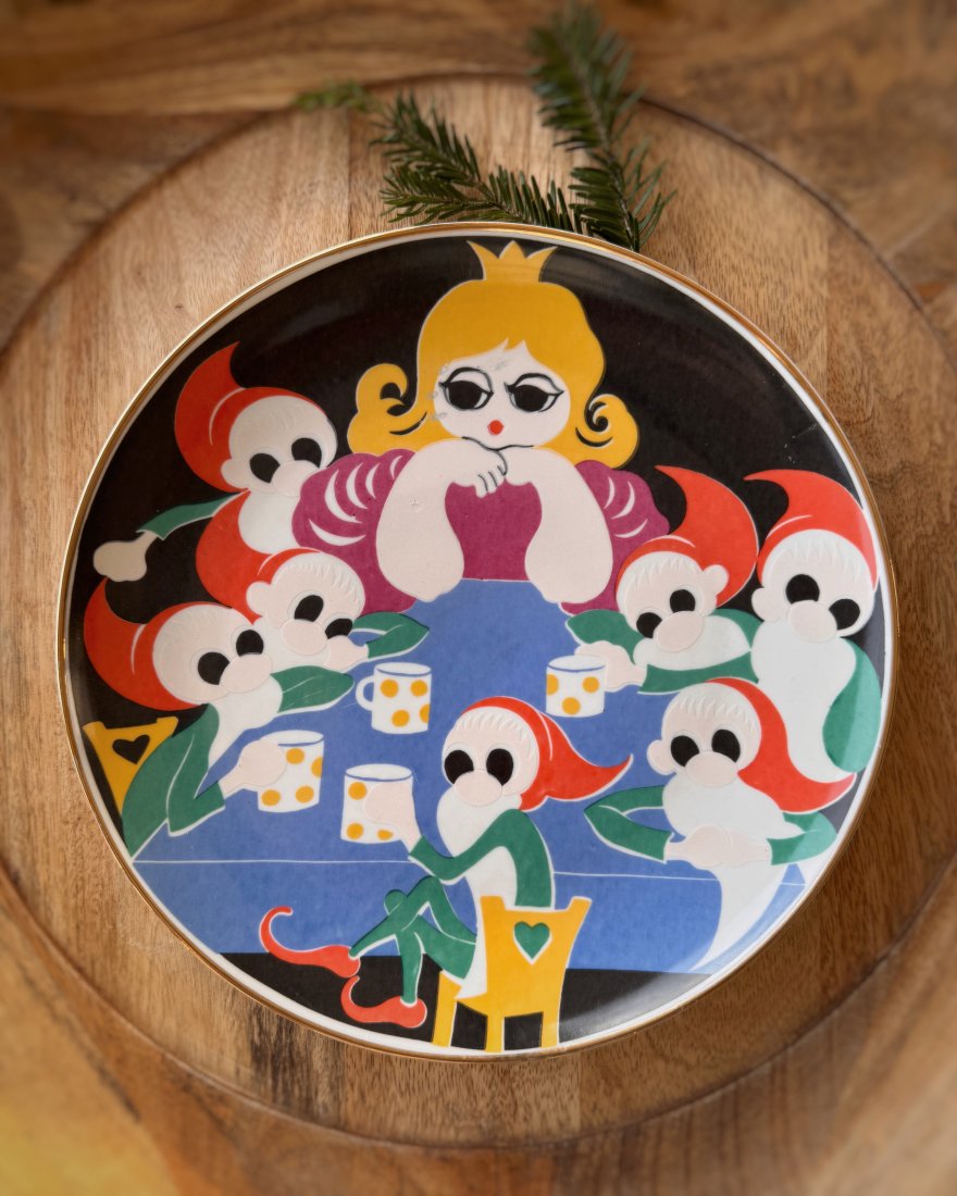 Talerz dekoracyjny z serii Bajka, wykonany z porcelany, zdobiony kolorową kalkomanią z Królewną Śnieżką i siedmioma krasnoludkami.