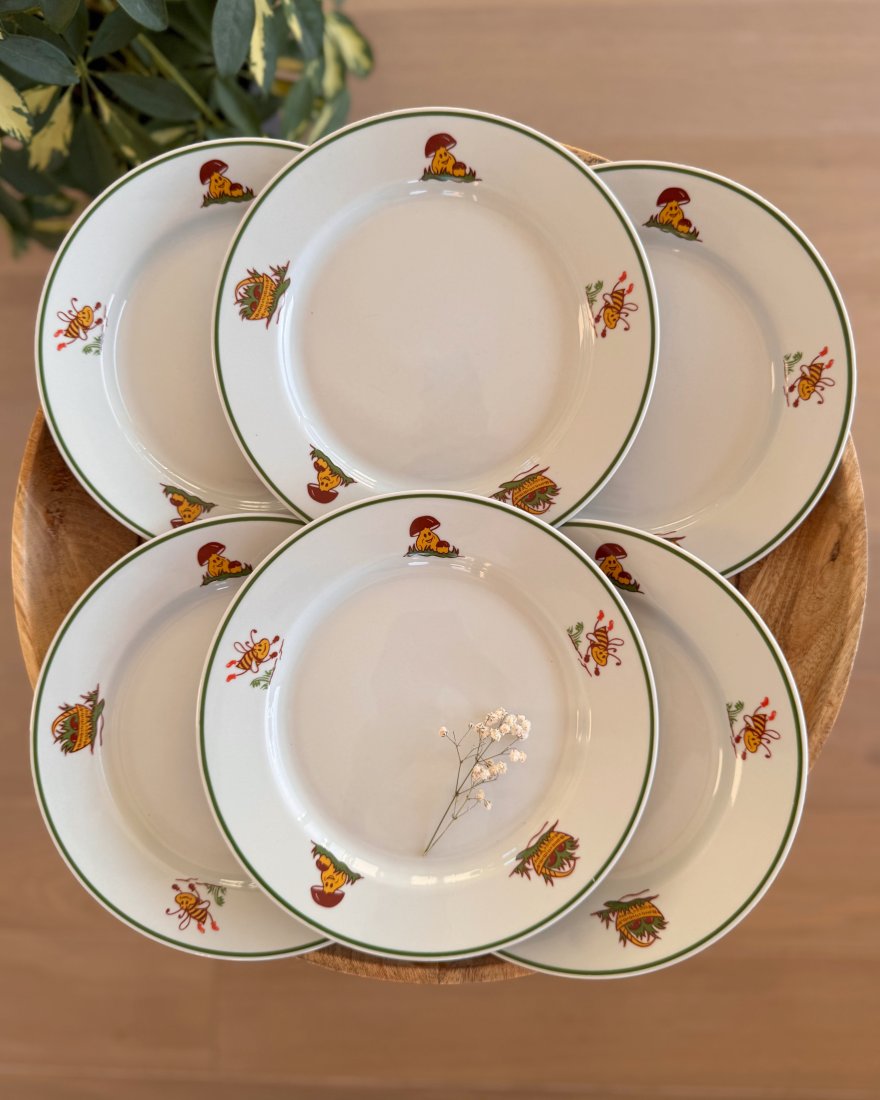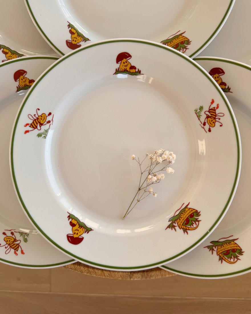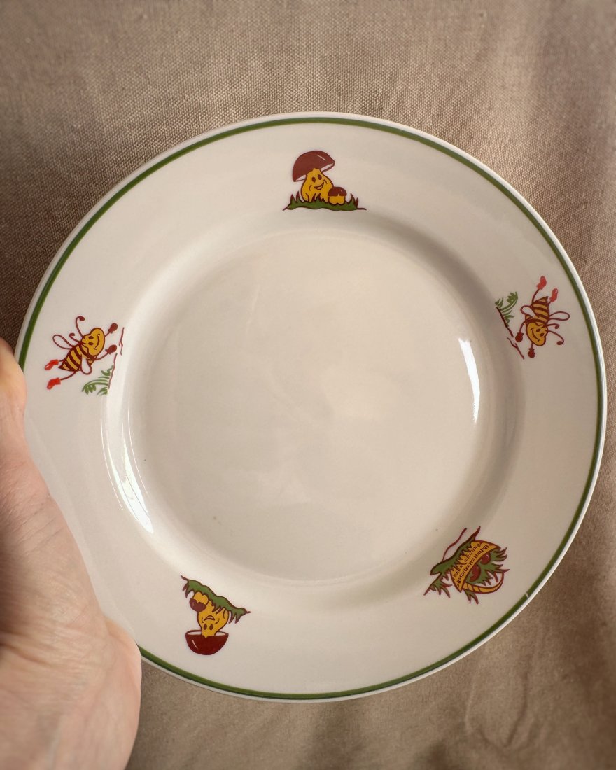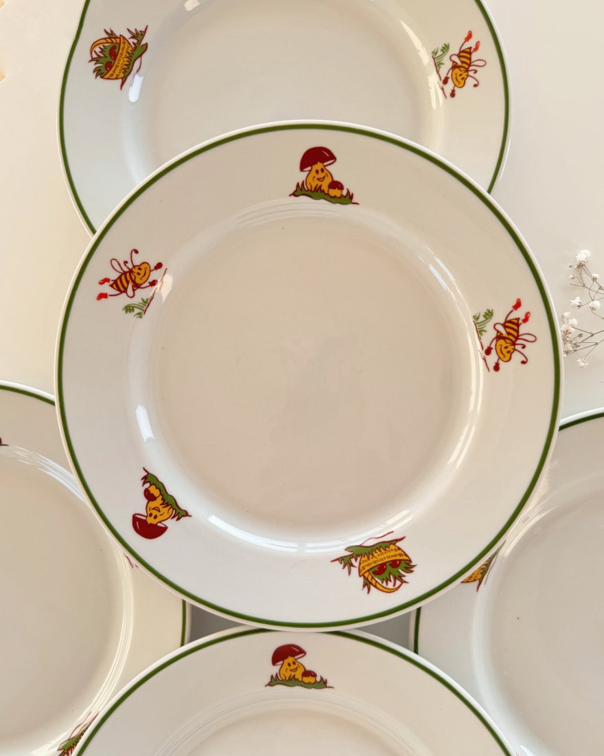 Talerze obiadowe płaskie zdobione kolorowymi dekoracjami w stylu dziecięcym.