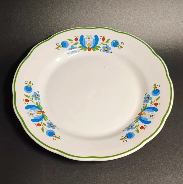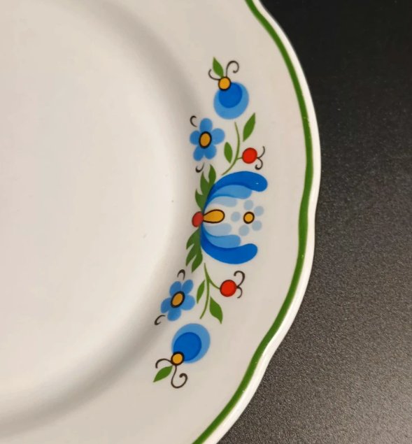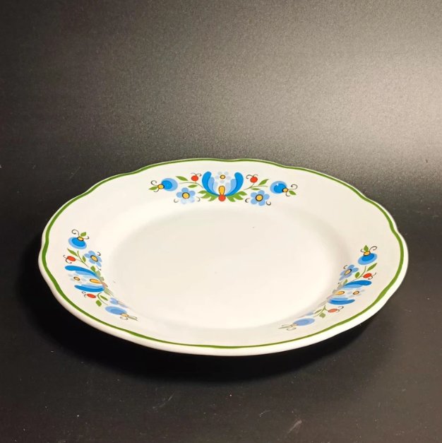 Talerz obiadowy z kultowym dekorem. Wyprodukowany w fabryce Lubiana. Wersja eksportowa.