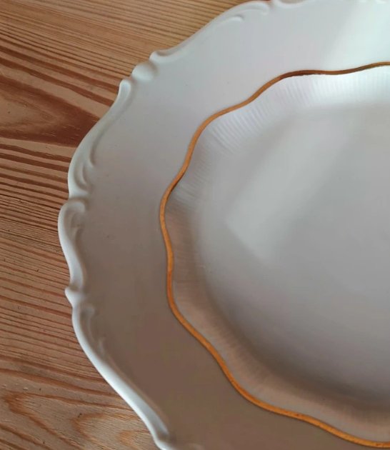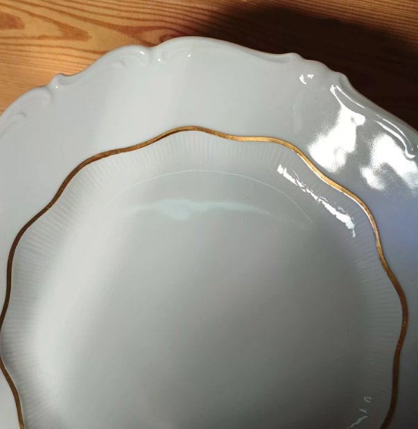 Śliczny talerz obiadowy z białej porcelany ze złoceniami. Sygnowany Sorau. Średnica 25 cm