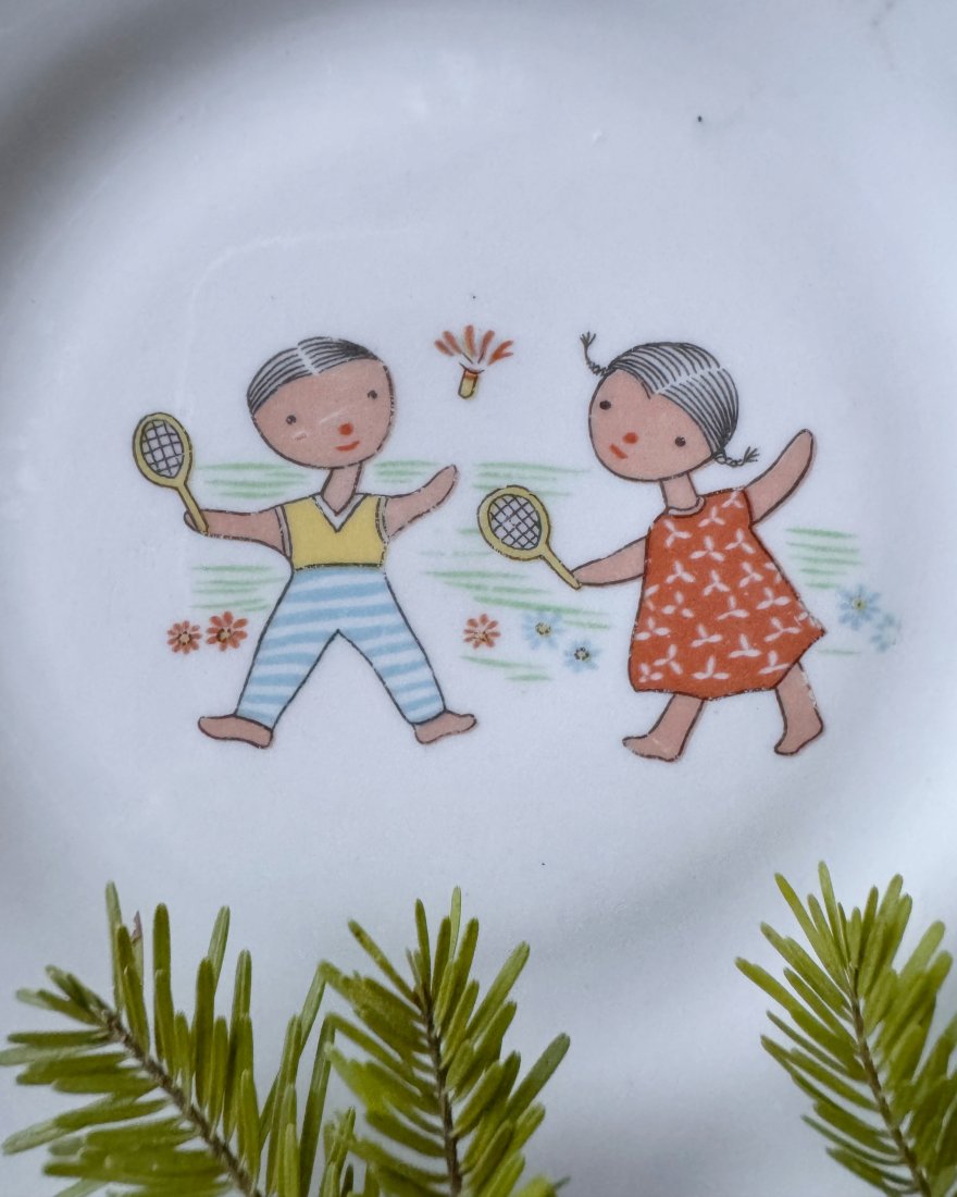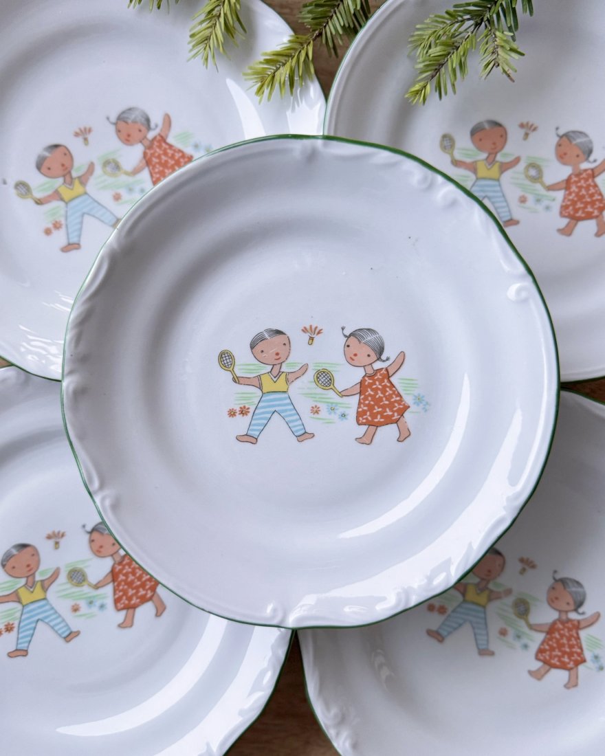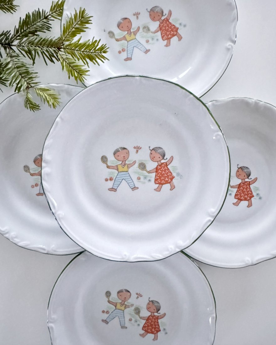 Talerz śniadaniowy z serii z Jackiem i Agatką, wykonany z porcelany, zdobiony kalkomanią, reliefem i zielonym paseczkiem przy rancie.