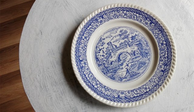 Motyw z krajobrazem wiejskim, malatura niebieska, szkliwiony.