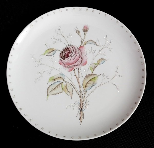 Duży, talerz z ręcznie namalowaną różą i napisem po niemiecku : " W 50. rocznicę ślubu, rząd stanu Dolna Saksonia".