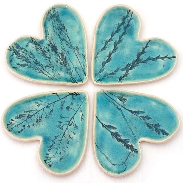 Ręcznie wykonany komplet ceramiczny z odciskanymi roślinami.