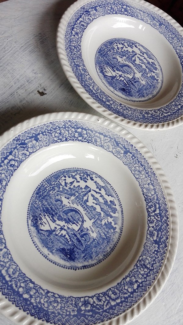 Motyw z krajobrazem wiejskim, malatura niebieska, szkliwiony.Głęboki-na zupę.