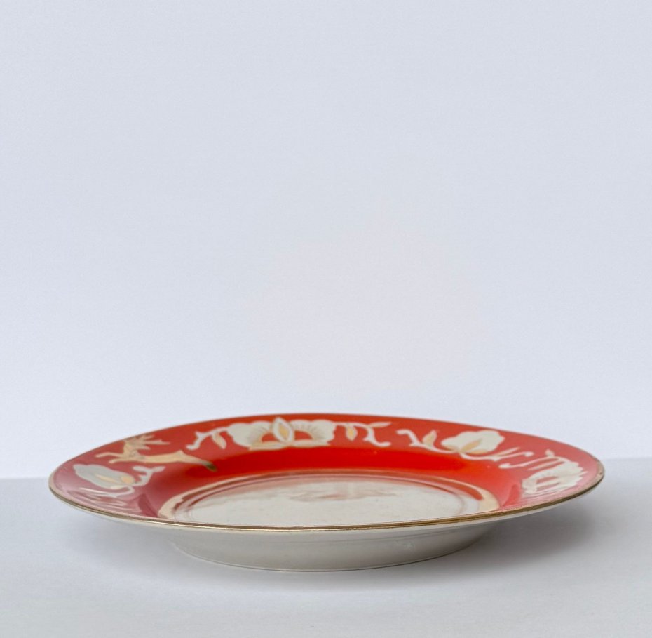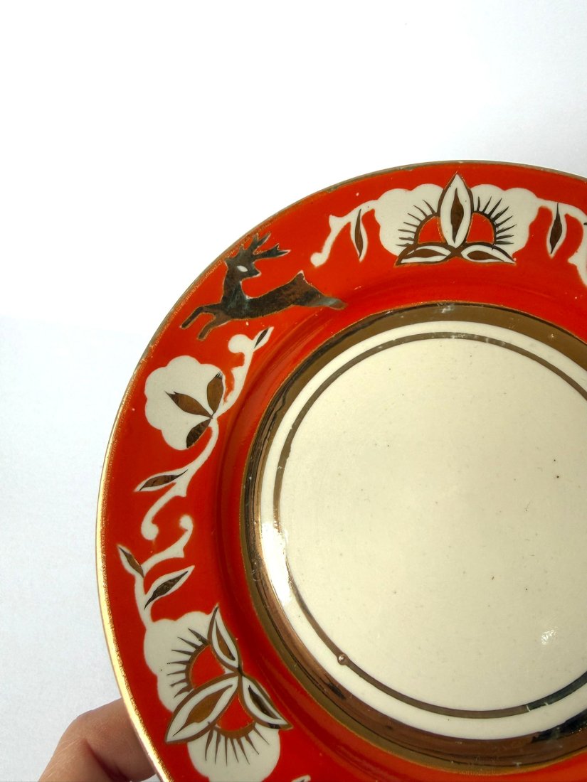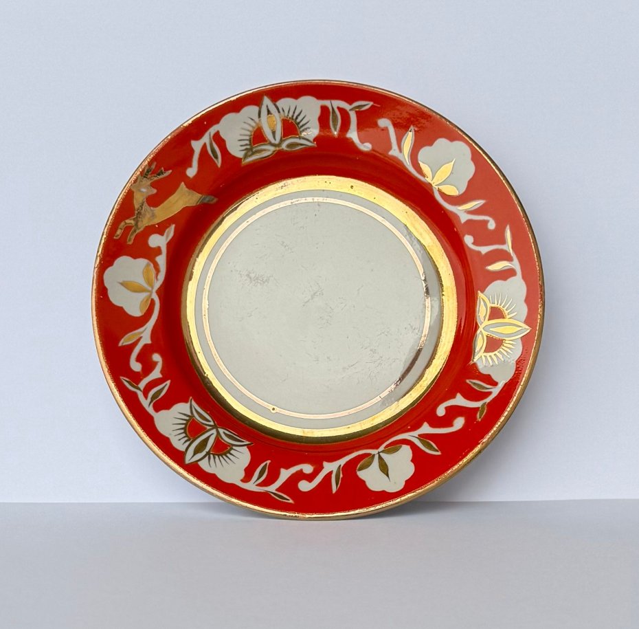 Talerzyk wykonany z porcelany, ręcznie malowany, utrzymany w charakterystycznym stylu ludowym Azji Środkowej. Przyciąga wzrok intensywnym pomarańczowo-czerwonym kolorem oraz bogatymi zdobieniami w bieli i złocie. Na rancie widoczny jest motyw jelenia oraz roślinnych ornamentów, typowych dla uzbeckiego rzemiosła artystycznego.