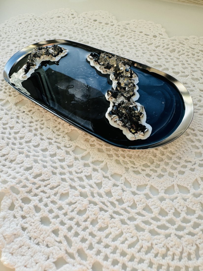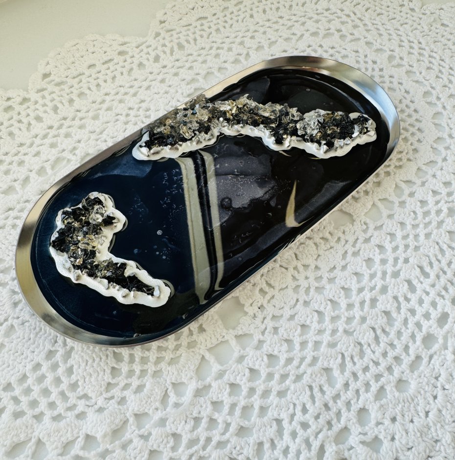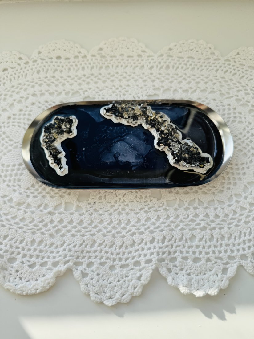 Metalowy talerzyk zdobiony tuszami, tłuczonym szkłem i żywicą epoksydową. Wyrafinowana, subtelna ozdoba do Twojego domu. Idealny do przechowywania ulubionej biżuterii, którą nosisz na co dzień. Sprawdzi się w łazience, na stoliku nocnym lub w każdym innym wygodnym dla Ciebie miejscu.