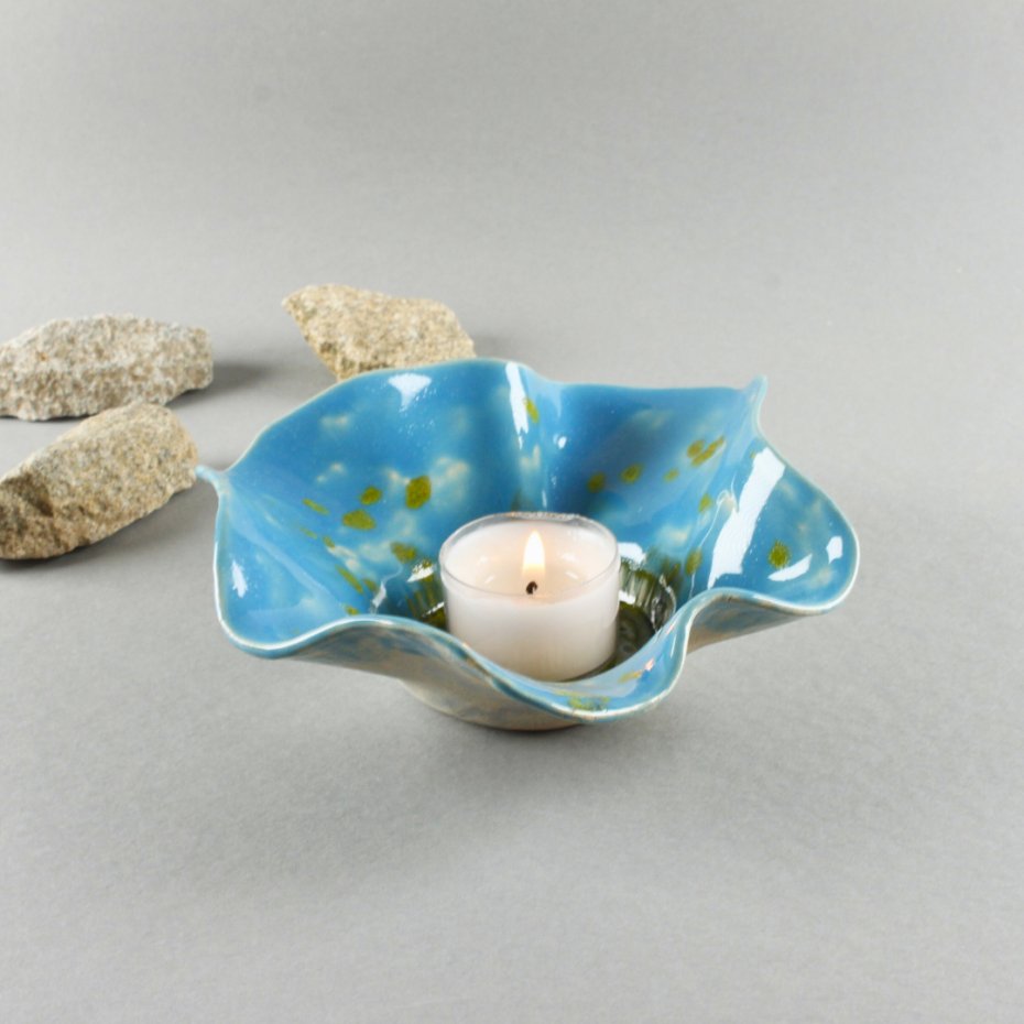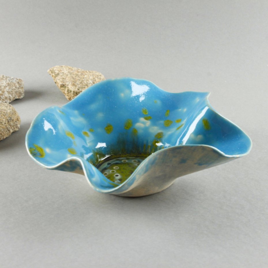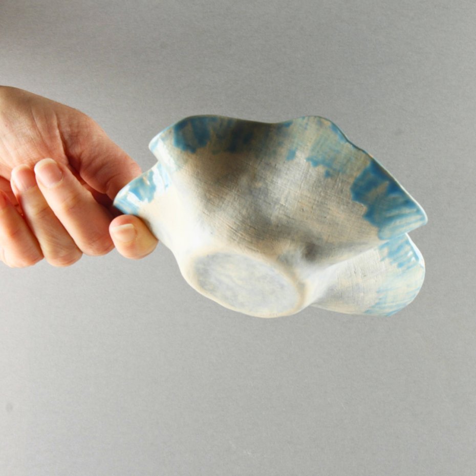 Ręcznie lepiona ceramiczna miseczka w kształcie nieregularnego kwiatka na biżuterię, świeczkę lub inne drobiazgi. Wykonana z jasnej gliny.