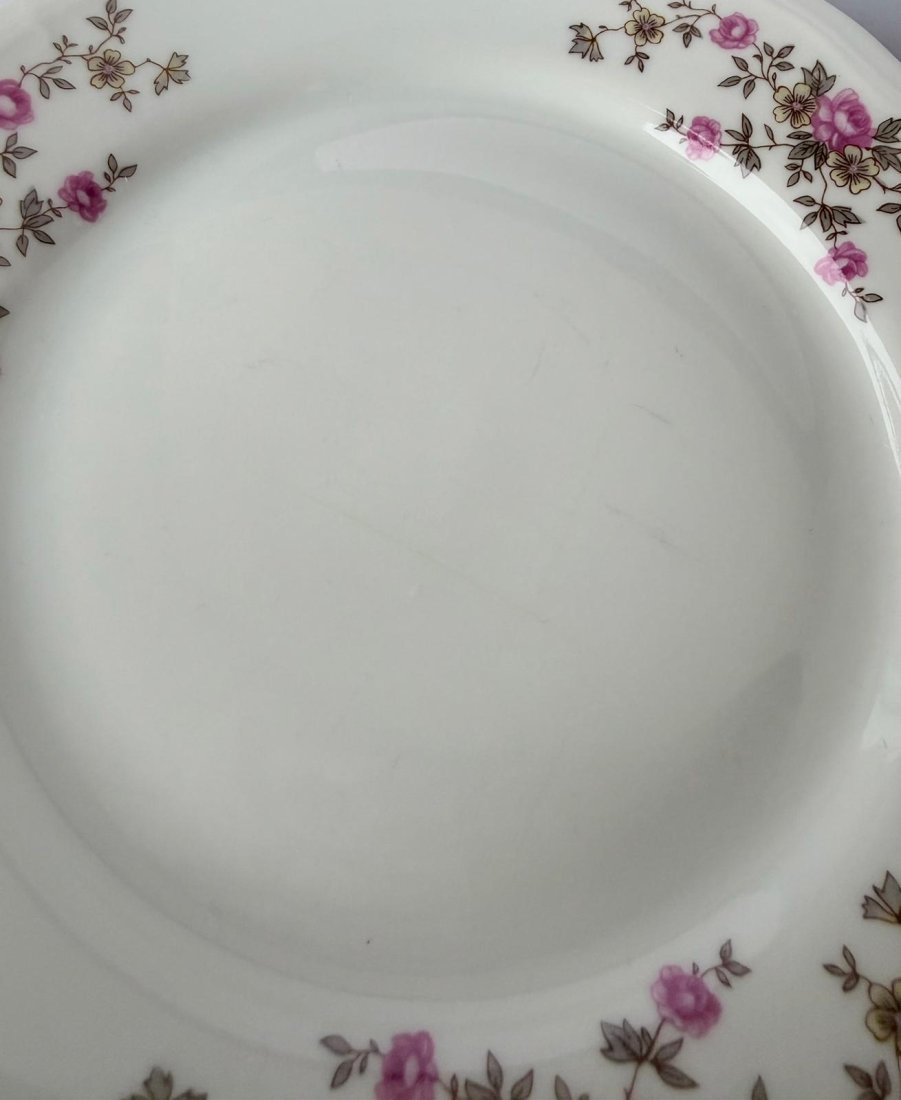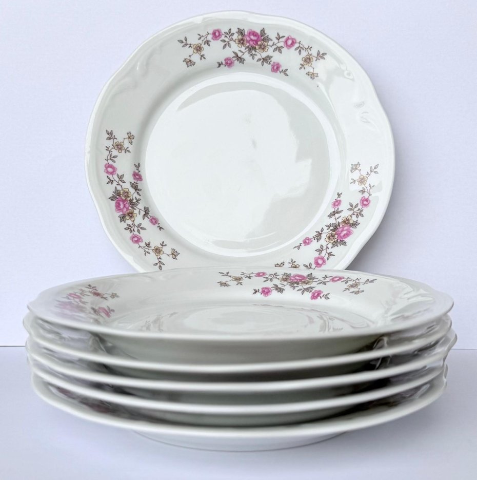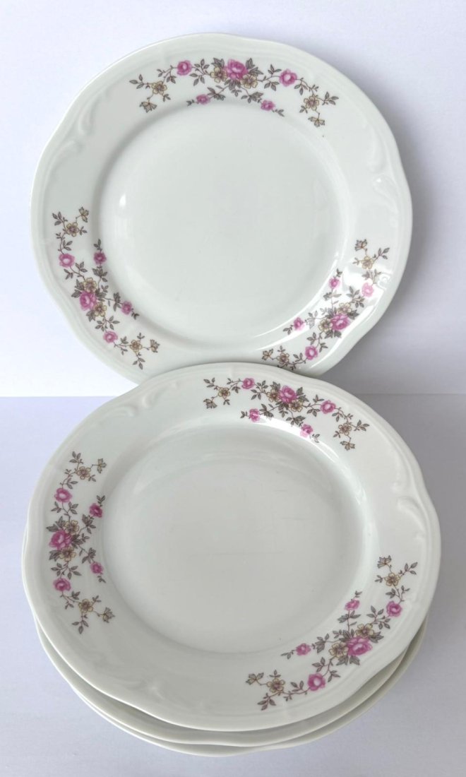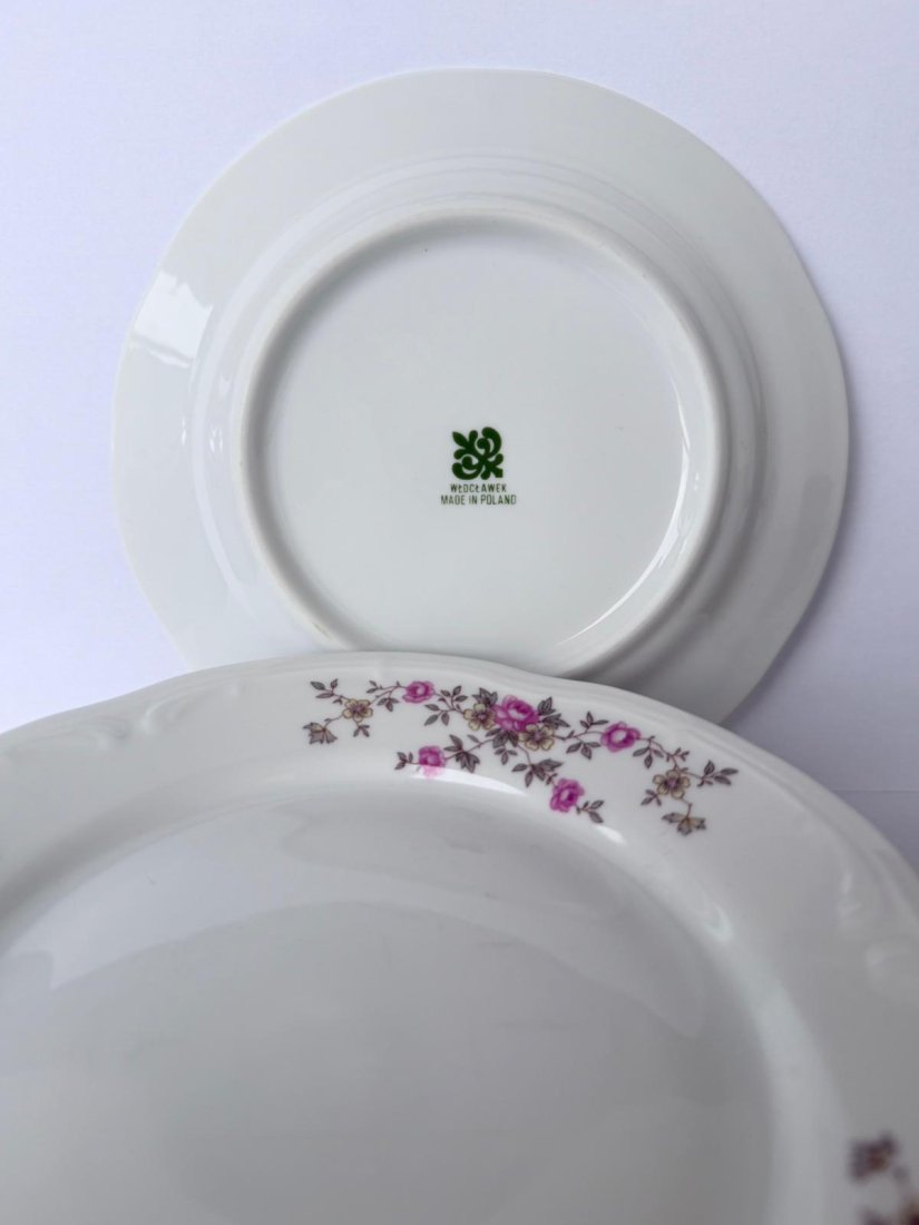 białym o delikatnie falowanym brzegu, zdobiona subtelnym motywem drobnych różowych kwiatów rozmieszczonych wokół rantów. Dekor jest charakterystyczny dla produkcji z tego okresu — elegancki, stonowany i ponadczasowy. Na spodzie każdego talerzyka znajduje się zielona sygnatura WŁOCŁAWEK – MADE IN POLAND.