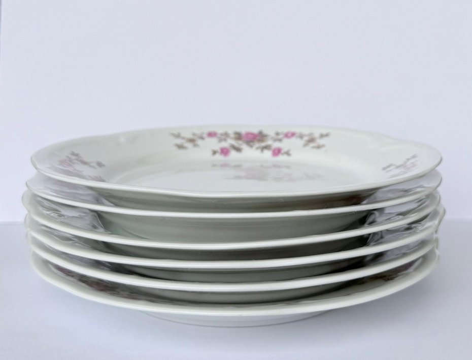 Komplet sześciu porcelanowych talerzyków deserowych z wytwórni Włocławek, pochodzących z lat 70. i 80. XX wieku.