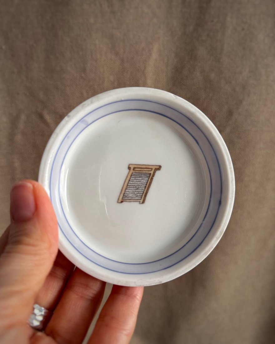 Wykonane z porcelany, zdobione kolorową kalkomanią i ręcznie malowane przy rancie.