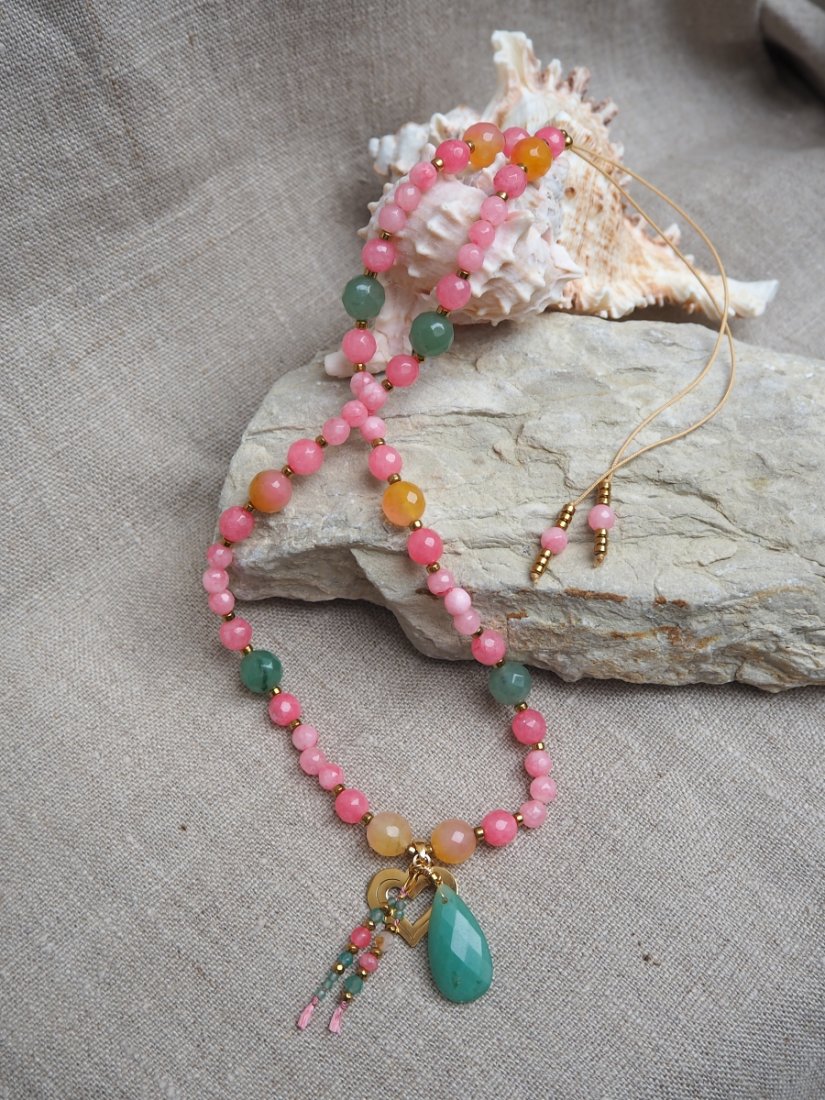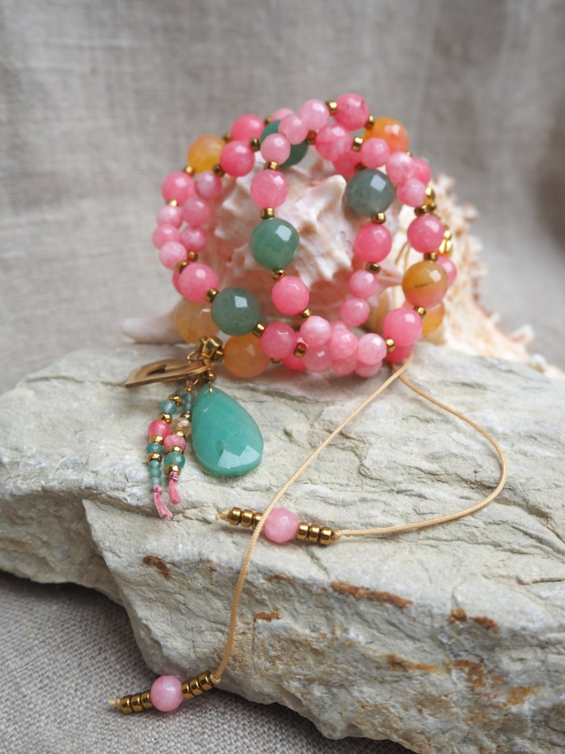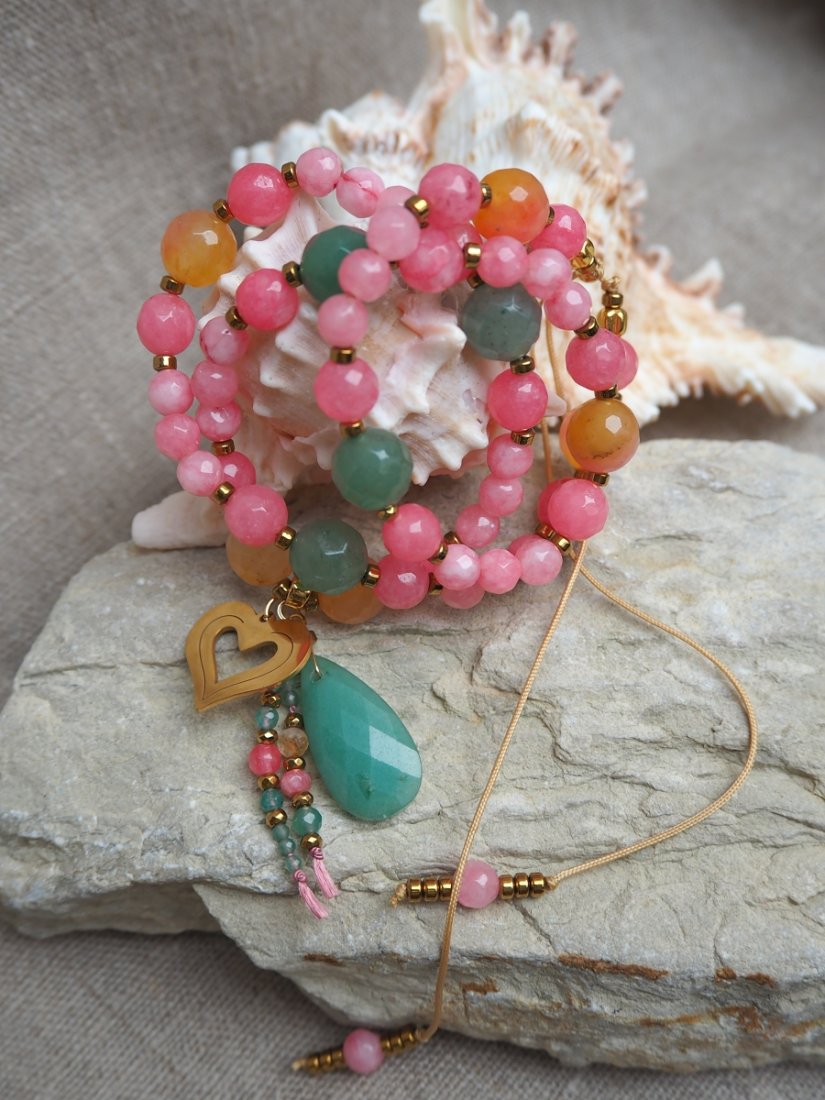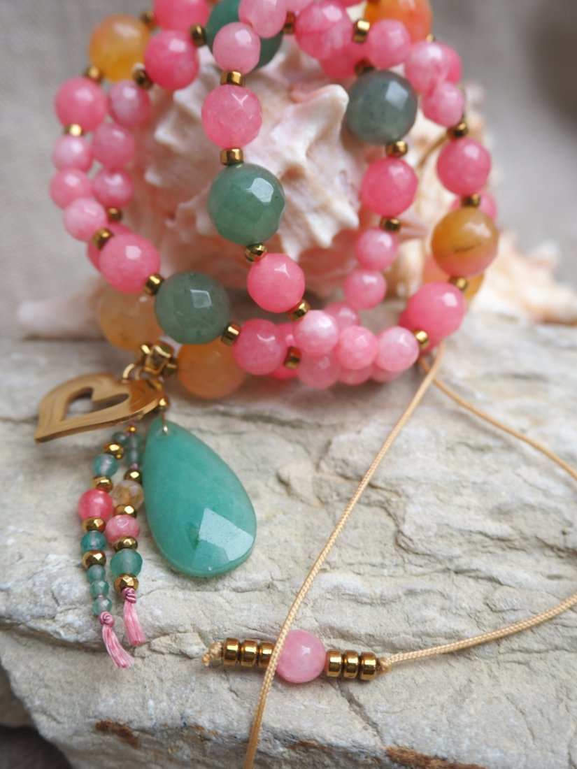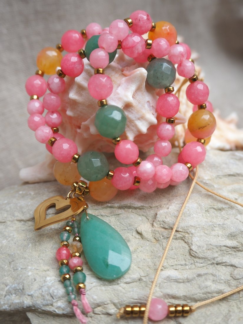 Wykonany z ręcznie fasetowanych jadeitów w odcieniach różu, zielonego awenturynu i ciepłego agatu, ozdobiony przekładkami z hematytu i stali chirurgicznej oraz uroczym złotym sercem i łezką awenturynu.