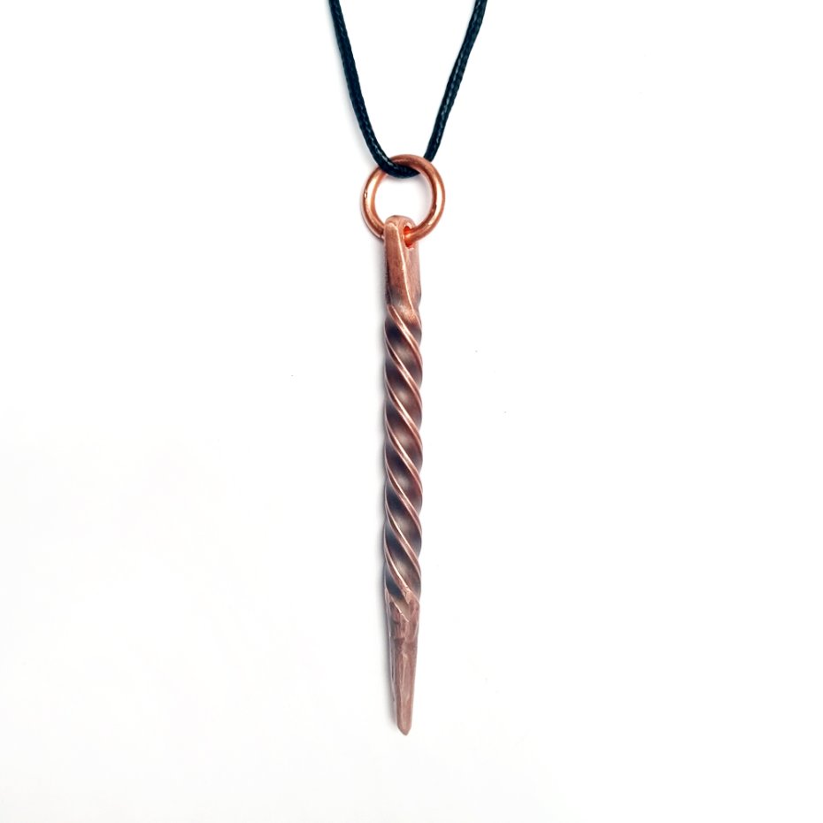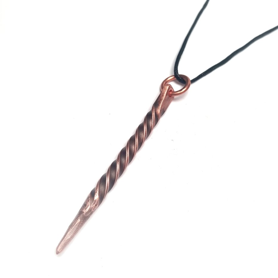 Wisiorek wykonany z czystej, polskiej miedzi z kawałka pręta odpowiednio walcowanego, kutego i skręcanego. Naturalna oksyda ogniowa nadająca mu antycznego charakteru. Ręcznie przecierany. Podobne wisiorki nosili Wikingowie, dla których stanowił amulet ochronny i był jednocześnie narzędziem do pisania run na glinianych płytkach.