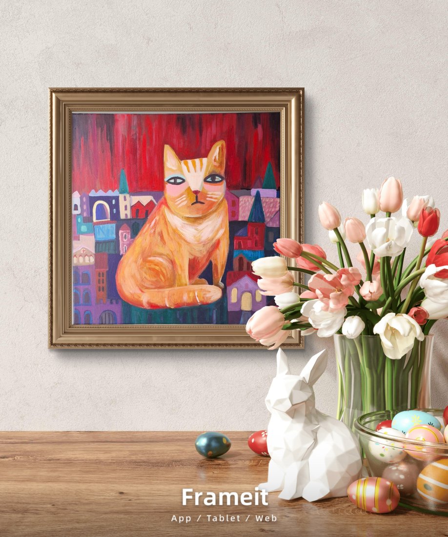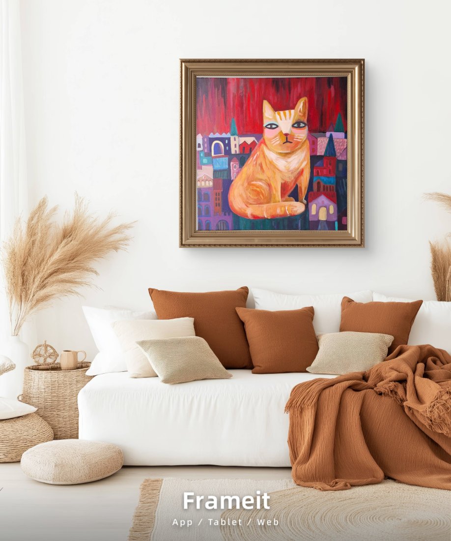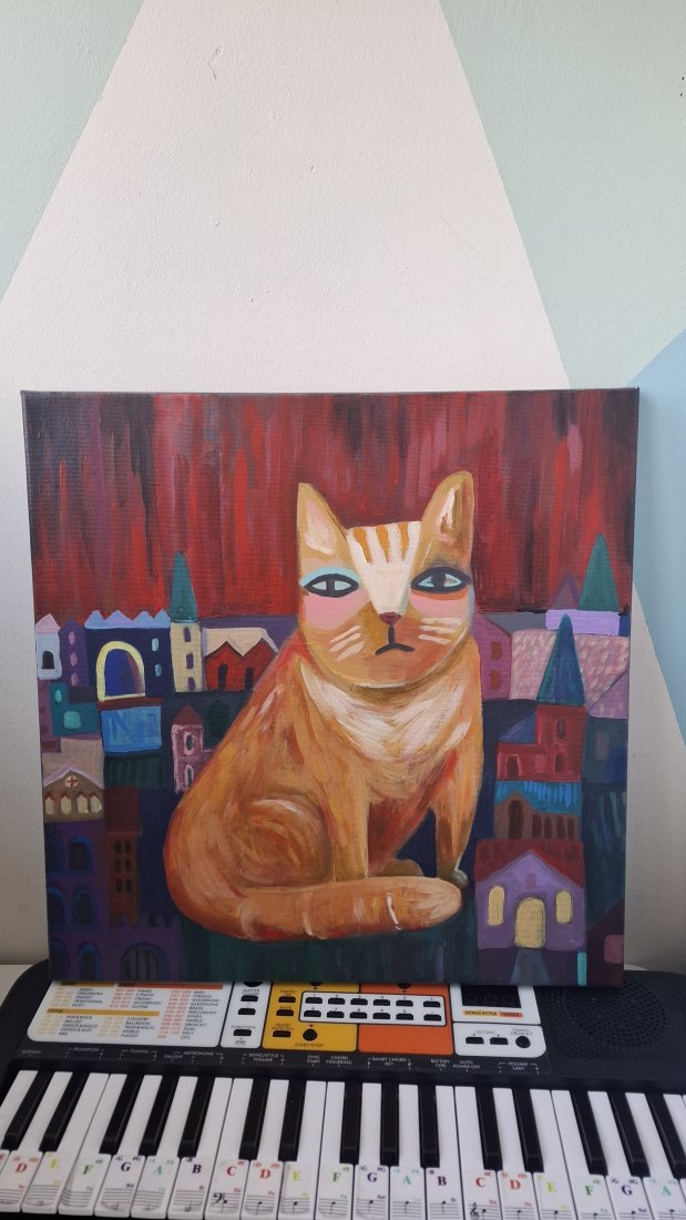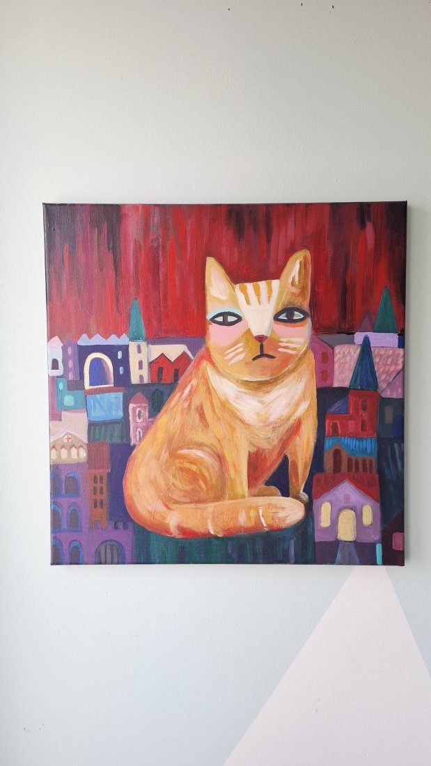 Kolorowy pełen uroku obraz z rudym kotem na tle miasta.
