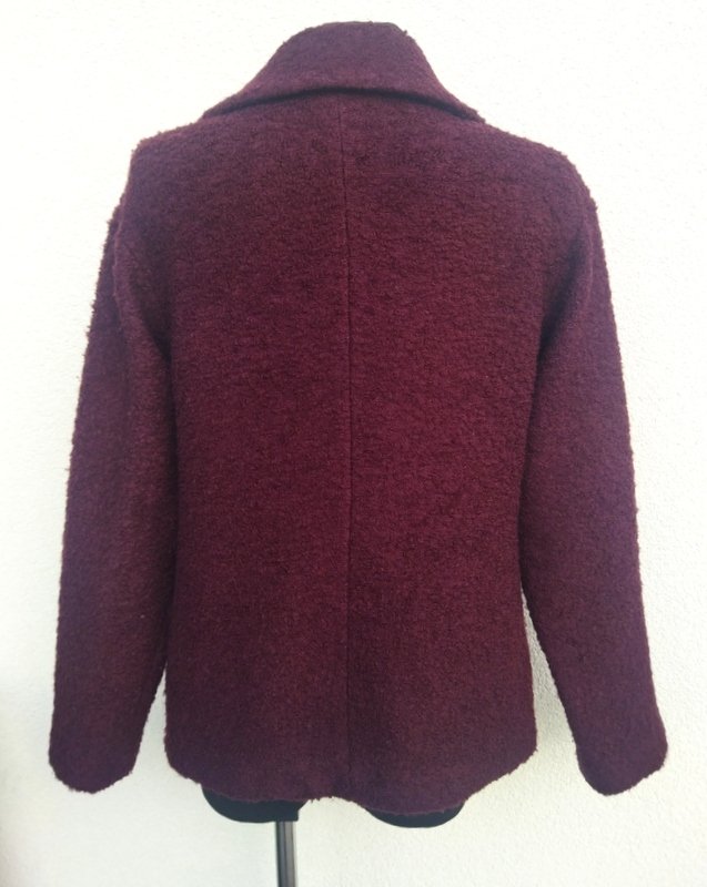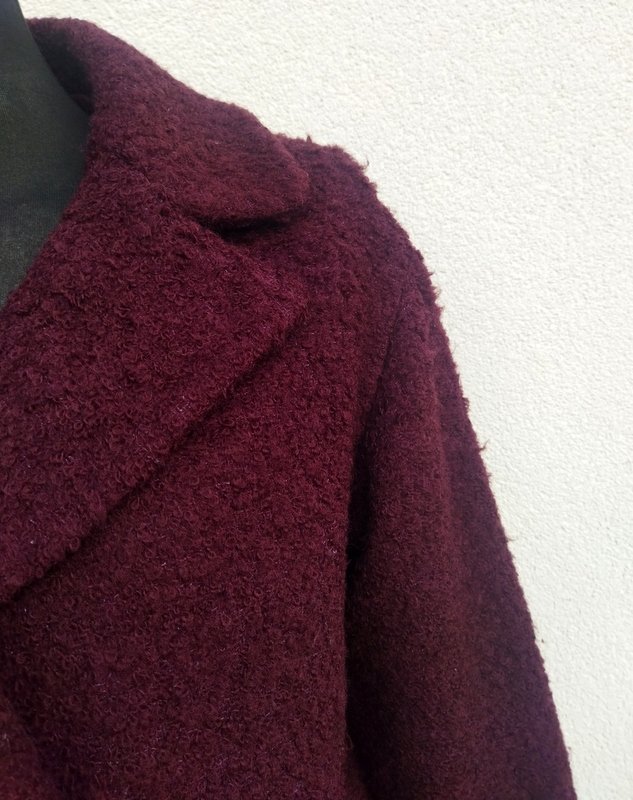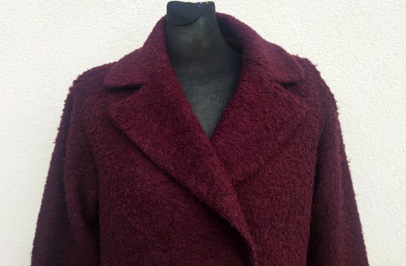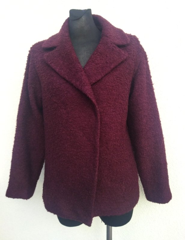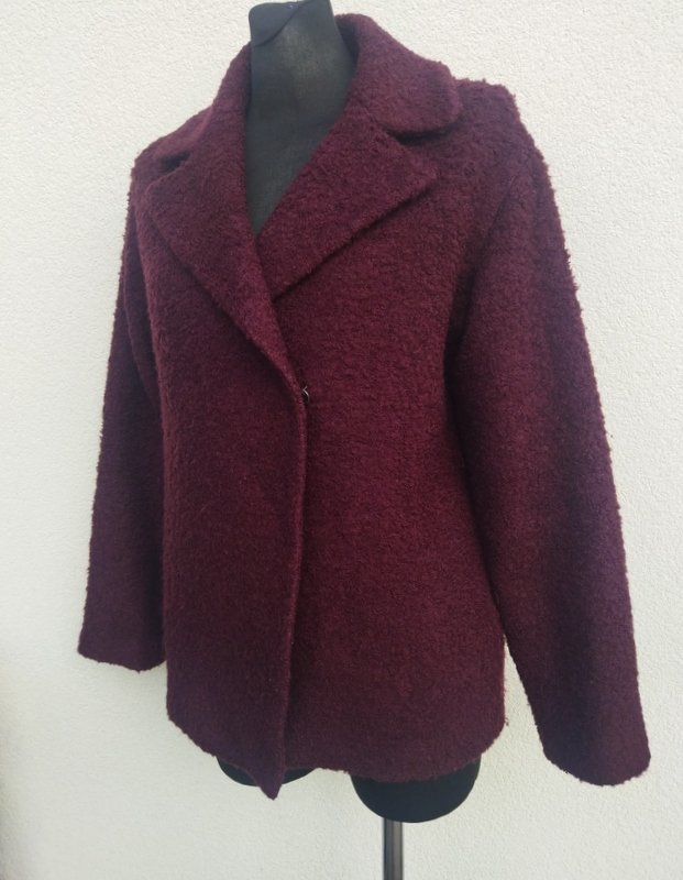 Kurtka z wełnianej tkaniny w bakłażanowym kolorze z faktura drobne boucle. Z kołnierzem z rewersami, zapinana , od wewnątrz na dwie zatrzaski. całość na podszewce w kolorze tkaniny wierzchniej