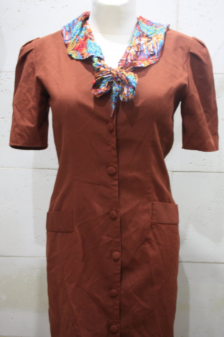 brązowa sukienka vintage z uroczym małym wiązanym kołnierzykiem, zapinana po całości na guziki, po bokach klapki imitujące kieszenie, krótki rękawek, w ramionach mini poduszki