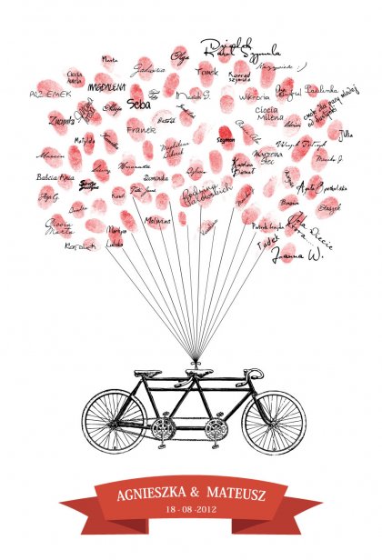 Jest to unikalny, spersonalizowany obraz. Na obrazie podana jest data Waszego ślubu oraz imiona pary młodej. Odciski palców tworzą baloniki, które sprawiają wrażenie jakby unosiły rower wpisów w górę.