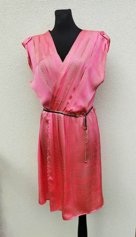 Cudna sukienka z delikatnej zwiewnej tkaniny poliestrowej w dotyku jak jedwab w koralowej kolorystyce łączonej z beżem. Zakładana kopertowo, odcinana w pasie , góra zdobiona zakładkami miejscowo zaszywanymi, na ramionach pagony, talia ze szlufkami na pasek, dół trapezowy. Bez podszewki. Sprzedawana bez paska na zdjęciu.