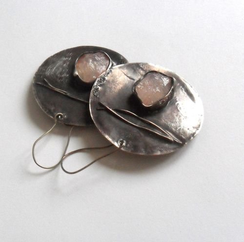 Kolczyki miedziane z surowym kwarcem różowym,średnica 4,5cm.Bigle srebrne.