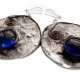 Kolczyki tarcze wykonane ręcznie z miedzi lutowane przy użyciu stopu cyny i srebra ozdabiane szklanymi granatowymi kaboszonami . Koła stylizowane na stare srebro i ręcznie polerowane. Średnica kół wynosi ok 4.8 cm - zawieszone na zamykanych biglach. Zapraszam do zakupu..