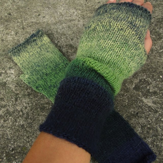 Lekkie mitenki wykonane ręcznie z wysokiej jakości,cienkiej włóczki ( 75%wełna, 25% poliamid) w odcieniach zieleni i granatu... Miękkie i miłe w dotyku. Niebanalny dodatek i ochrona przed chłodem. Długość: ok. 30 cm.