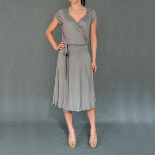 Kopertowa sukienka marki Atmosphere w kolorze taupe / cappuccino. Na zdjęciu wyszła bardziej szara - w rzeczywistości bardziej wpada w brąz latte.