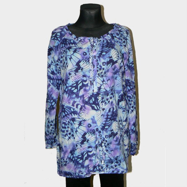 Lekka tunika w barwny motyw w odcieniach niebieskiego i fioletu marki TCM. Dekolt zapinany na haftki. Na wysokości bioder wciągnięty troczek do związania.