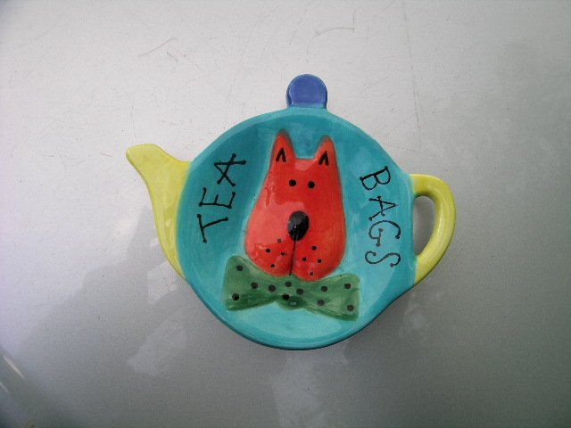 Ceramiczny spodek na herbaciane torebki, cytrynę etc. Na błyszcząco szkliwiony,Ręcznie malowany z dowcipnym,kolorowym,radosnym wizerunkiem . .