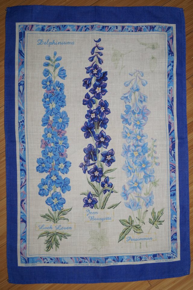 Lniany ręcznik kuchenny irlandzkiej produkcji Ulster Weavers z serii DELPHINIUMS, cudne kolory: lawendowy, fiolet, błękit, odcienie zieleni, ozdobiony motywem roślinnym