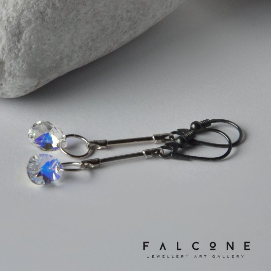 Długie, subtelne kolczyki. Nowoczesna forma srebra połączona z romantycznym blaskiem kryształów Swarovskiego. Kryształowe łzy mienią się ciepłymi tonacjami. Srebro 925 ma dwie barwy, jasną i ciemną. Długość kolczyków to ok. 5 cm.